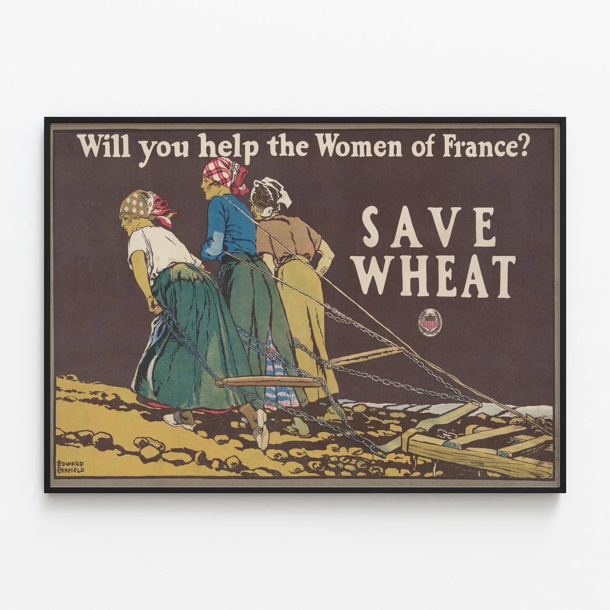 Entdecken Sie dieses eindrucksvolle Vintage-Poster mit dem Titel „Will you help the Women of France? Save Wheat“, das die Stärke und den Beitrag französischer Frauen im landwirtschaftlichen Einsatz hervorhebt. Dieses Plakat zeigt drei Frauen beim Pflügen eines Feldes, was die harte und wesentliche Arbeit symbolisiert, um die Weizenernte zu bewahren – ein lebenswichtiges Element. Diese Wanddekoration trägt eine kraftvolle Botschaft der Solidarität, typisch für Propagandaplakate des frühen 20. Jahrhunderts. Dieses Wandbild, signiert von Edward Penfield, besticht durch seinen alten grafischen Stil, der durch warme, erdige Farben aufgewertet wird und an die landwirtschaftliche Landschaft erinnert. Der Kontrast zwischen dem dunklen Hintergrund und den dynamischen Silhouetten der Frauen zieht den Blick auf sich und verleiht diesem Plakat eine markante Präsenz in jedem Dekorationsraum. Ideal für Liebhaber von Geschichte und Retro-Dekoration, kann dieses Stück sowohl im Wohnzimmer, in einer Bibliothek als auch im Büro seinen Platz finden und eine authentische, bedeutungsvolle Atmosphäre schaffen. Es ist auch ein Ausdruck kultureller und sozialer Betätigung, der insbesondere die Zeit widerspiegelt, in der Frauen eine aktivere Rolle in der Landwirtschaft übernahmen, wodurch die Wertschätzung der weiblichen Rolle in traditionell männlich dominierten Branchen gestärkt wird. Mit diesem Poster integrieren Sie ein dekoratives Objekt mit einer kraftvollen, geschichtsträchtigen Botschaft. Die englische Aufschrift „Will you help the Women of France? Save Wheat“ lädt zu einer Reflexion über kollektive Unterstützung und den Erhalt der Nahrungsmittelressourcen ein. Dieses originelle Wanddekoration passt perfekt zu Vintage-, Industrie- oder Landhausstil-Innenräumen und lässt sich mühelos mit anderen historischen Postern oder Zeitdokumenten kombinieren. Seine ausgewogene Gestaltung und das Format, das darauf ausgelegt ist, Aufmerksamkeit zu erregen, machen es zu einem markanten Dekorationselement, ideal, um eine Küchen-, Esszimmer- oder Arbeitswand mit einem Hauch von Geschichte und Symbolik zu bereichern. Kurz gesagt, dieses Poster „Save Wheat“ ist ein dekoratives Stück, das sowohl ästhetisch ansprechend als auch bedeutungsvoll ist. Dank seines ausdrucksstarken Designs und seiner humanistischen Botschaft stellt es eine passende Wahl für jede Wanddekoration dar, die Kunst, Geschichte und Engagement verbinden möchte. Bringen Sie mit diesem einzigartigen Plakat über Frauen, Landwirtschaft und Ressourcenschutz einen Hauch von Authentizität und Nachdenklichkeit in Ihr Zuhause.