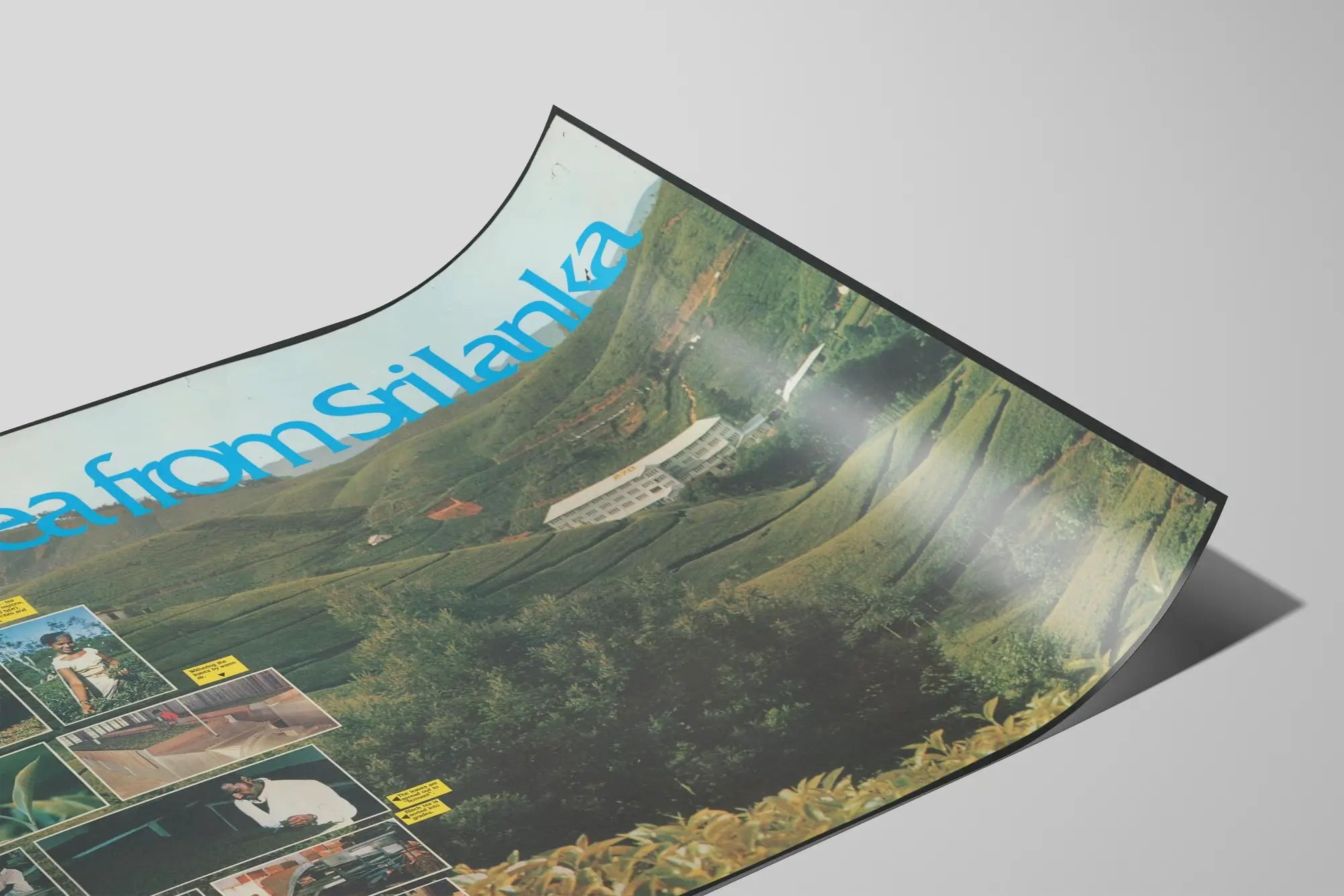 Dieses Vintage-Poster „Tee aus Sri Lanka“ ist ein einzigartiges Stück für Ihre Wanddekoration und zeigt die üppigen Landschaften der Teegärten in Sri Lanka. Es bietet einen authentischen Einblick in die verschiedenen Phasen des Teeanbaus und der Produktion, von den jungen Trieben bis zur Auswahl der fermentierten Blätter und ihrer Umwandlung in schwarzen Tee. Die eingebundenen zahlreichen Fotografien zeigen die grünen Plantagen im Hintergrund, eine Karte der Anbaugebiete sowie detaillierte Aufnahmen der Arbeiter und der verwendeten Verfahren.