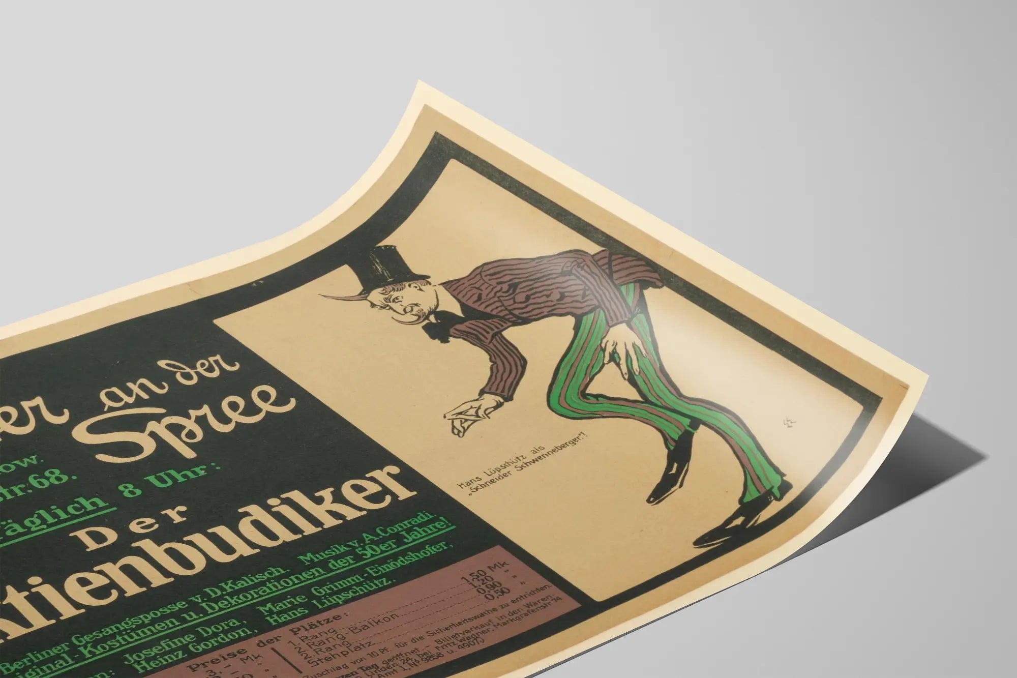 Dieses Vintage-Poster zeigt eine Werbung für das Theater „Theater an der Spree“, bei der das Stück „Der Aktienbudiker“ im Mittelpunkt steht. Es handelt sich um ein altes Stil-Poster mit einer markanten Schriftart, die handgeschriebene Buchstaben mit klassischen Zeichen kombiniert und eine theaterähnliche Atmosphäre vergangener Zeiten evoziert. Das Bild zeigt rechts eine Illustration einer Figur in einem gestreiften Anzug in Grün und Violett, mit Zylinder auf dem Kopf, die eine expressive Bühnenhaltung einnimmt – was diesem Wanddekorationselement einen künstlerischen Charme verleiht. Dieses Poster ist ideal für Liebhaber von Retro- und Theater-inspirierter Wandgestaltung. Es erinnert an die Welt des Berliner Theaters mit einer typischen, grafischen Inszenierung, die sich perfekt in ein Vintage-Ambiente, ein kreatives Büro, ein Wohnzimmer oder einen Raum für Kultur und Kunst integrieren lässt. Der Kontrast zwischen dem dunklen Hintergrund und den Text-Elementen in Creme- und Grüntönen schafft einen ansprechenden visuellen Effekt und verstärkt die dekorative Wirkung. Als Poster ist dieses Werk eine ausgezeichnete Wahl, um eine Wand zu schmücken und dabei einen Hauch von Geschichte und Authentizität zu vermitteln – besonders für diejenigen, die sich für klassisches Theater und deutsche Kultur interessieren. Es handelt sich um ein echtes Wanddekorationselement, das einen Dialog zwischen Kunst, Geschichte und Grafikdesign pflegt und Ihrem Raum Charakter sowie eine nostalgische Note verleiht. Kurz gesagt, dieses Vintage-Poster von „Der Aktienbudiker“ ist viel mehr als nur eine einfache Wanddekoration: Es ist eine visuelle Hommage an einen bestimmten Moment in der Theatergeschichte, eingefangen durch einen sorgfältigen grafischen Stil und eine expressive Illustration. Perfekt für Kultur- und Kunstliebhaber, verleiht es jeder Ausstellungswand eine einzigartige und elegante Ausstrahlung.