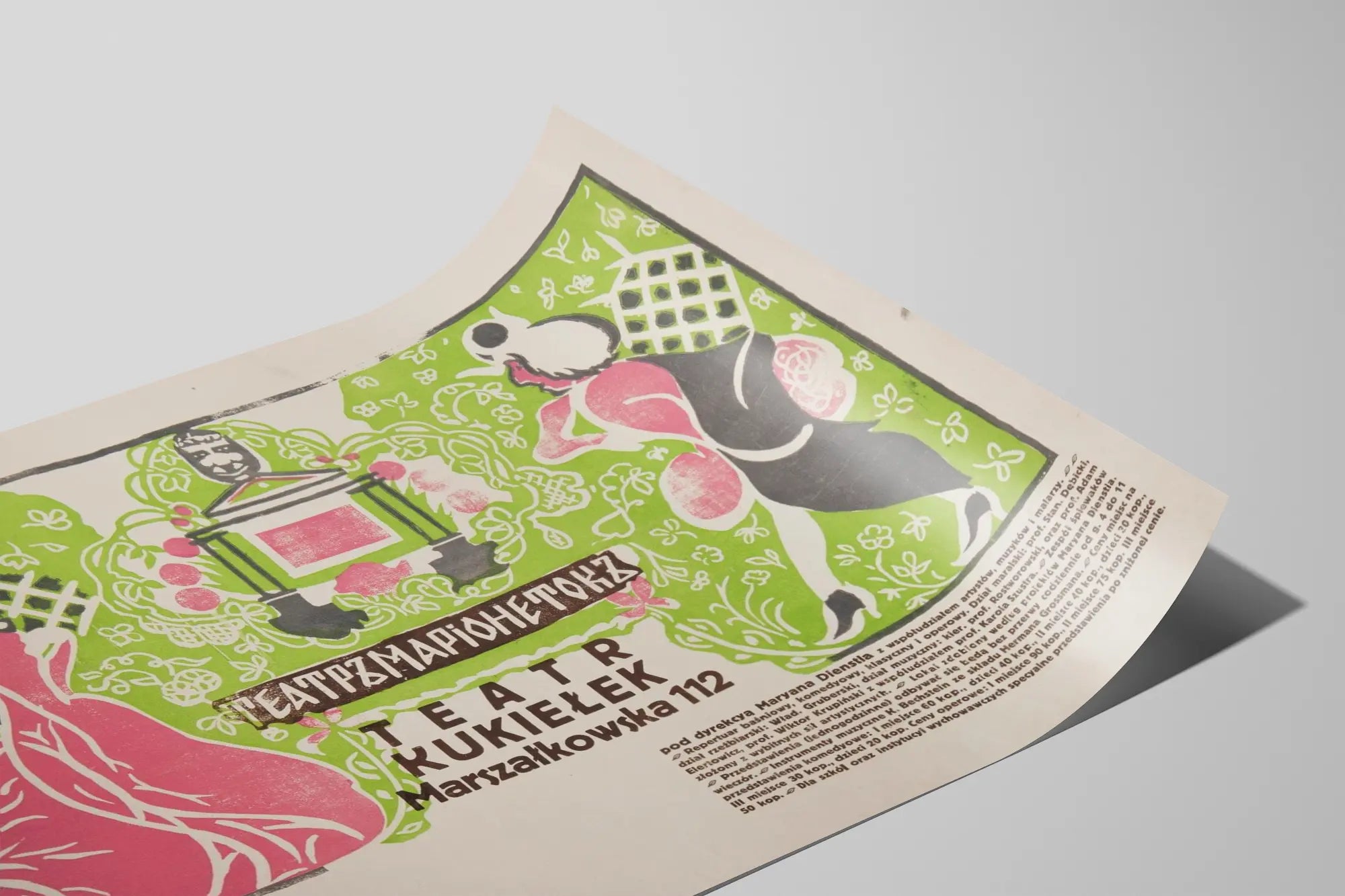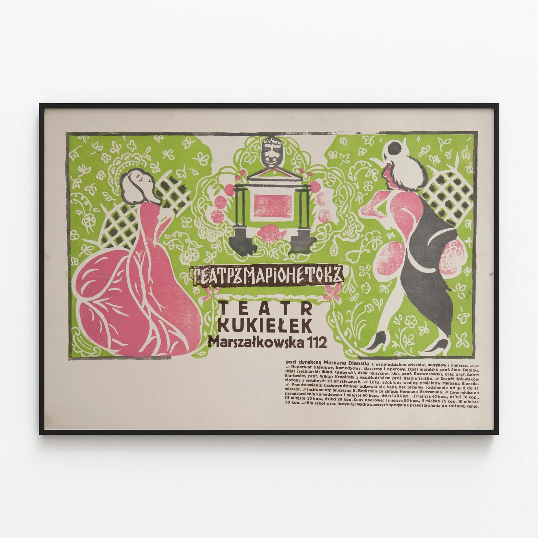 Dieses Vintage-Poster zeigt ein Puppentheater mit dem Titel „Teatr Kukiełek“, gelegen in der Marszałkowska-Straße 112. Diese farbenfrohe Wanddekoration verbindet dominante Nuancen von Grün, Rosa und Schwarz in einem retrografischen Stil. Zwei stilisierte Figuren, eine in einem langen rosa Kleid und die andere in dunkler Kleidung mit einem weißen Hut, rahmen ein kleines, illustriertes Puppentheater im Zentrum. Die floralen Muster im Hintergrund verleihen eine elegante und zarte dekorative Note und schaffen eine leichte, verspielte Atmosphäre. Der Text in besonderen Schriftarten hebt die Identität des Theaters hervor und informiert über die Leitung durch Maryana Dienstla sowie das vielfältige Programm mit Märchen-, Komik-, Klassiker- und Opernaufführungen, die alle von Künstlern mit Musikern und Malern begleitet werden. Dieses Poster ist ein Schlüsselstück für Liebhaber origineller Wanddekorationen, die ihrem Zuhause eine künstlerische und kulturelle Note verleihen möchten. Es wird als einzigartiges Plakat geschätzt, ideal zur Dekoration eines Wohnzimmers, eines Spielzimmers oder eines kreativen Raums und lädt ein, in die Welt des traditionellen Puppenspiels einzutauchen. Sein authentischer, farbenfroher Stil macht es zu einem Blickfang, der gleichzeitig einen sehr geschätzten Retro-Charme versprüht. Als Wanddekoration verkörpert dieses Vintage-Poster den Geist des Puppenspiels, verbindet visuelle Poesie mit fröhlicher Atmosphäre und ist perfekt, um einen Raum mit Eleganz und Originalität zu beleben.