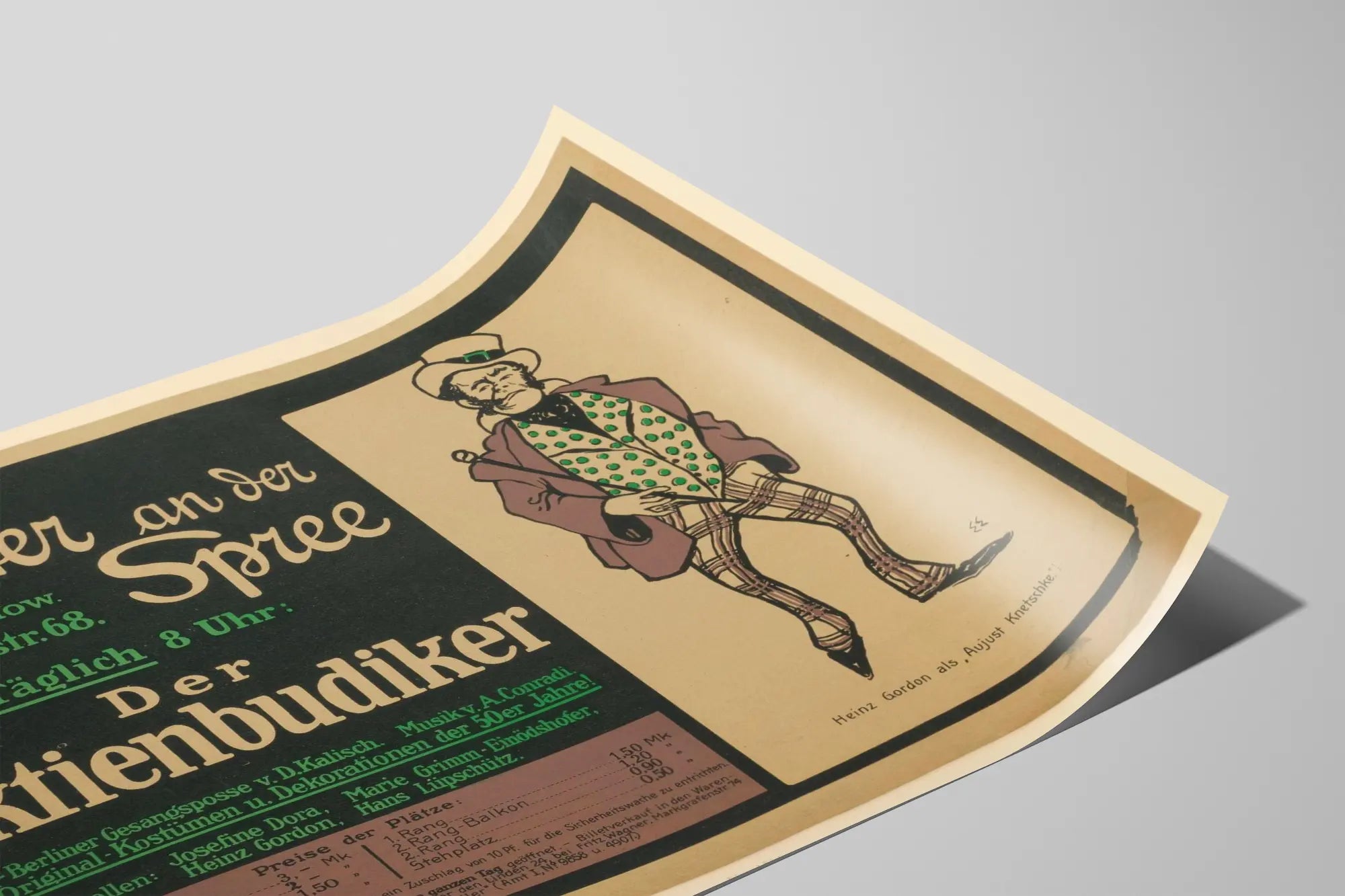 Dieses Vintage-Poster bietet eine einzigartige Wanddekoration, gewidmet dem Theaterstück „Der Aktienbudiker“. Es zeigt ein stilisiertes typografisches Layout kombiniert mit einer Illustration einer Figur in historischer Kleidung, erkennbar rechts auf dem Plakat. Das Plakat kündigt das Theater „Theater an der Spree“ an, gelegen in Köpenickerstr. 68, unter der Leitung von Philipp Spandow, mit täglichen Vorstellungen um 20 Uhr. Der Text hebt ein musikalisches oder gesungenes Stück hervor, das als typische Berliner Komödie charakterisiert ist, mit Musik von A. Conradi und Texten von D. Kalisch sowie authentischen Kostümen und Bühnenbildern aus den 1850er Jahren. Zu den Hauptschauspielern gehören Namen wie Josefine Dora, Marie Grimm-Einödshofer, Heinz Gordon und Hans Lüpschütz. Der illustrierte Teil zeigt einen Mann mit Zylinder, kariertem Jackett und Hose, der einen Stock hält und einen ausdrucksstarken Gesichtsausdruck zeigt, wahrscheinlich die Rolle des Aujust Knetschke, gespielt von Heinz Gordon. Dieses alte, in Deutsch gedruckte Poster spielt mit einem Kontrast aus dunklem Grün, Schwarz und Beige und verleiht eine sehr typische Retro-Atmosphäre der Theaterplakate des 19. und 20. Jahrhunderts. Es ist ein perfektes Wanddekorationselement für Liebhaber der Theatergeschichte, des historischen Grafikdesigns oder der germanischen Kultur. Dieses Wandbild in Form eines Posters eignet sich ideal, um ein Wohnzimmer, Büro oder Kulturraum zu schmücken und verleiht einen authentischen und originellen Vintage-Touch. Sein altes grafisches Design passt mühelos zu klassischer oder eklektischer Inneneinrichtung und unterstreicht eine raffinierte, historisch verwurzelte Atmosphäre. Diese Wanddekoration ist ein schönes Beispiel für die Verbindung zwischen bildender Kunst und Theatererbe und bietet ein Sammlerstück oder einen dekorativen Akzent für Theaterliebhaber und Kulturenthusiasten im deutschen Raum.