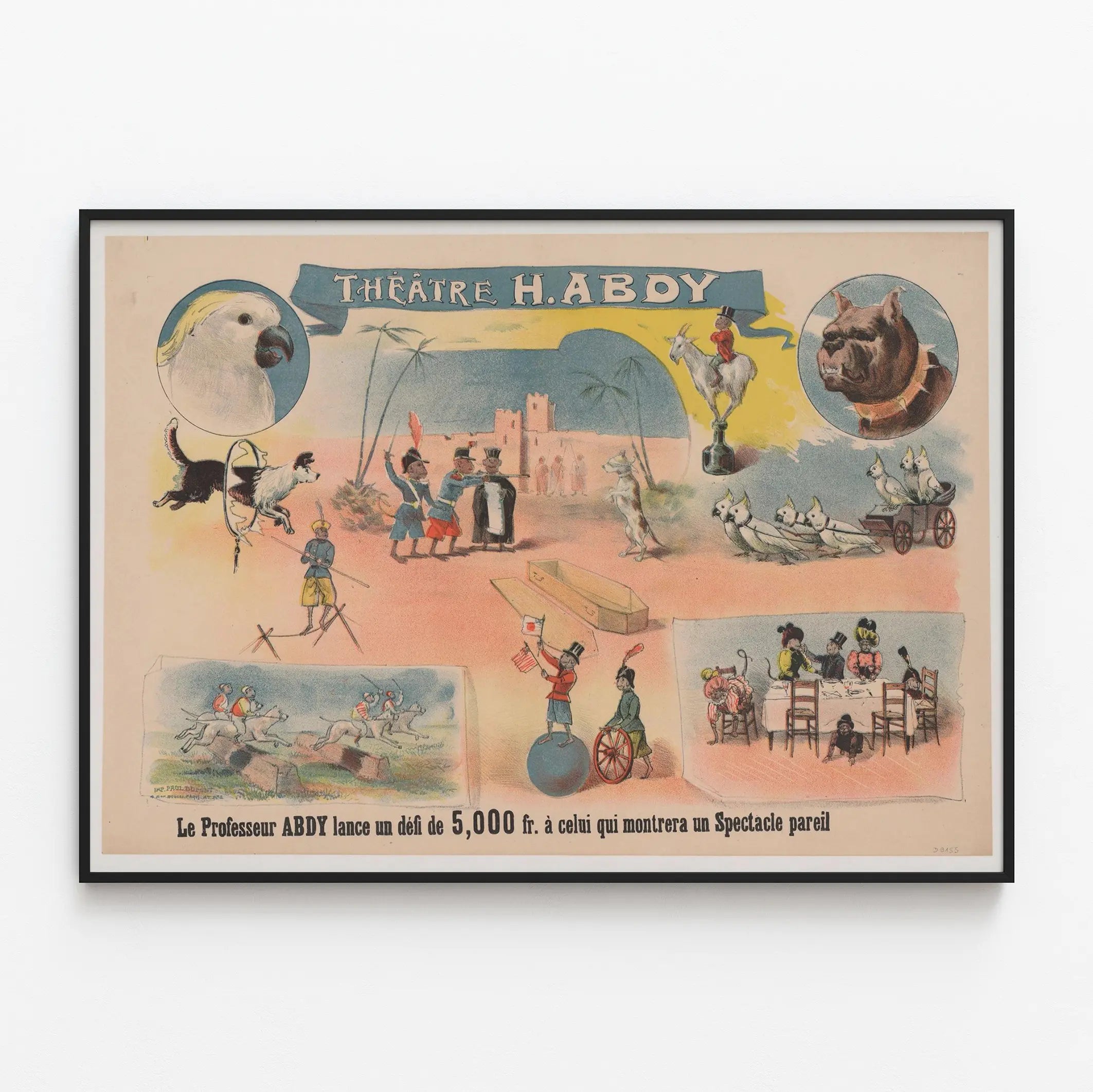 Dieses Vintage-Poster ist ein ikonisches Stück des Theaters H. Abdy und illustriert die Herausforderung, die Professor Abdy gestellt hat: 5.000 Franken für jeden, der eine identische Vorstellung präsentieren kann. Dieses antik wirkende Poster fängt mit Feinfühligkeit und Humor eine Show ein, die gezähmte Tiere und spektakuläre Nummern kombiniert. Man erkennt verschiedene Elemente der Theaterbühne, wie einen Papagei, einen Hund, der durch einen Reifen springt, Schauspieler in historischer Kostümierung, eine Ziege, die von einer kleinen Figur mit Zylinder gesteuert wird, und mehrere Kakadus, die in eine spielerische Inszenierung eingebunden sind. Die farbenfrohe und zarte Atmosphäre dieser Wanddekoration ist perfekt für Liebhaber von Retro-Kunst und Theatergeschichte. Als künstlerisches Poster oder Wandbild verleiht es Ihrer Raumgestaltung eine originelle und authentische Note. Ideal für ein Wohnzimmer, ein Büro oder einen Theatersaal lädt dieses Bild zu einer Zeitreise ein in die faszinierende Welt der Tierdressuren und Theateraufführungen vergangener Tage. Die ausgewogene Komposition hebt die Lebendigkeit der Figuren und Tiere in einer schlichten, aber ausdrucksstarken Kulisse hervor. Dieses Druckbild ist ein schönes Beispiel für Theater-Lithografien, die verwendet wurden, um einzigartige Aufführungen anzukündigen und zu feiern, und verschönert Ihre Wände stilvoll mit einer Atmosphäre voller Geschichte und Kreativität.