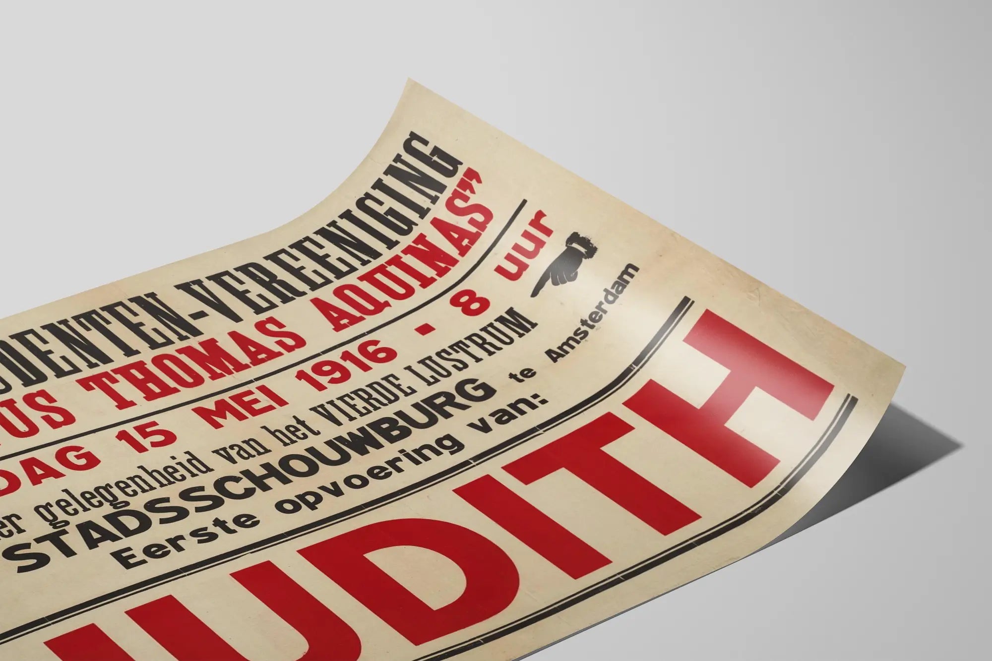 Dieses Vintage-Poster ist ein einzigartiges Wanddekorationselement für Liebhaber von Geschichte, Theater und Retro-Design. Es kündigt die erste Aufführung des Stücks "Judith" am Montag, den 15. Mai 1916, um 8 Uhr an, organisiert von der Studentenvereinigung R.K. Studenten-Vereeniging "Sanctus Thomas Aquinas" im Stadsschouwburg in Amsterdam. Dieses Plakat besticht durch seinen typischen grafischen Stil des frühen 20. Jahrhunderts, mit einer Anordnung in schwarzen und roten Großbuchstaben, die die wichtigsten Informationen hervorheben, insbesondere den Titel "JUDITH" in sehr großer roter Schrift in der Mitte. Der Text wechselt zwischen dicken und feinen Schriftarten, was einen interessanten visuellen Kontrast bietet, begleitet von schwarzen Indexsymbolen, die auf das Datum und die Uhrzeit zeigen. Dieses Poster ist eine ausgezeichnete Wahl für eine Wanddekoration in einem Interieur, in dem Vintage und typografische Eleganz geschätzt werden. Es verleiht einen historischen Charme, der an die Welt der holländischen katholischen Studentenvereinigungen und ihr kulturelles Engagement erinnert. Mit der Wahl dieses Posters zur Wandgestaltung lädt man sowohl zu einem kulturellen Nachdenken als auch zu einem ausgeprägten Stil ein, der Authentizität und Retro-Ästhetik vereint. Das Format dieses Posters ermöglicht es, jedes Detail hervorzuheben, vom Schriftbild bis zur Gesamtkomposition, und bietet so eine immersive Lesbarkeit und eine dauerhafte visuelle Anziehungskraft. Ideal für Wohnzimmer, Arbeitszimmer oder einen Raum für Kunst und Kultur, verkörpert diese Wanddekoration ein direktes Zeugnis eines konkreten kulturellen Ereignisses aus dem Jahr 1916 und unterstreicht die Bedeutung der Studentenvereinigungen im künstlerischen Leben Amsterdams. Dieses dekorative Poster ist auch perfekt für Sammler historischer Plakate oder zur Bereicherung einer thematischen Wandgalerie über Theater und darstellende Künste. Zusammenfassend ist dieses "Judith"-Poster von 1916 viel mehr als nur eine einfache Wanddekoration: Es ist ein Fragment visueller Geschichte, eine Hommage an eine Epoche und eine kulturelle Tradition, getragen von leidenschaftlichen Studenten.