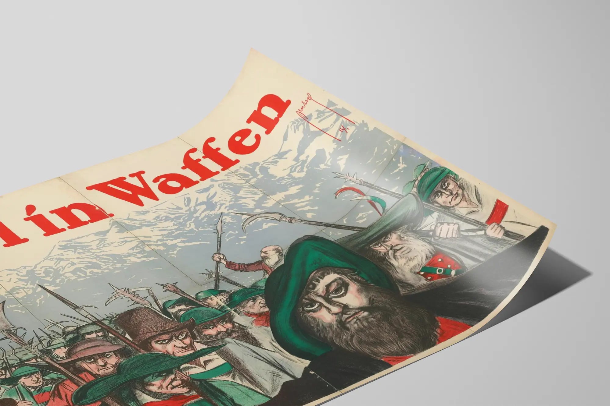 Dieses Vintage-Poster mit dem Titel „Tirol in Waffen“ ist ein echtes Beispiel künstlerischer Ausdruckskraft im Bereich der Wanddekoration. Es zeigt eine dramatische und intensive Szene mit einer Gruppe bewaffneter Männer, deren entschlossene Blicke auf eine historische Atmosphäre hinweisen. Die Komposition wird von einer großen Frontalfigur dominiert, einem bärtigen Mann mit grünem Hut, dessen kraftvoller Blick sofort die Aufmerksamkeit auf sich zieht, während die anderen Figuren hinter ihm eine kompakte Masse bilden und eine Stimmung von Mobilisierung oder kollektiver Widerstandskraft vermitteln. Die verwendeten Farben bevorzugen dezente und natürliche Töne, hauptsächlich dunkle Grün- und Rottöne, die im Kontrast zu dem stilisierten Bergpanorama im Hintergrund in Grau und Weiß stehen. Dieser Berg im Hintergrund erinnert an die Region Tirol und hebt ihren geografischen und historischen Kontext in dieser grafischen Darstellung hervor. Der in leuchtendem Rot gehaltene Schriftzug „Tirol in Waffen“ am oberen Rand des Posters setzt einen lebendigen und dynamischen Akzent, der die visuelle Wirkung und die Botschaft dieser Wanddekoration verstärkt. Dieses Poster eignet sich perfekt für eine dekorative Umgebung, die sowohl vintage als auch historisch wirkt, ideal für Kunstliebhaber, die eine erzählerische und symbolische Note in ihr Interieur bringen möchten. Ob im Büro, in einer Bibliothek oder in einem Raum mit historischem Thema – dieses Plakat zieht durch seinen markanten grafischen Stil und seine gekonnte Komposition die Blicke auf sich. Das große Format ermöglicht es, eine Wand kraftvoll zu gestalten und gleichzeitig eine starke visuelle Geschichte zu erzählen. Im Bereich der Wanddekoration wird dieses Poster wegen seiner Authentizität und seines originellen Ästhetik geschätzt, da es künstlerische Illustration mit einer eindrucksvollen Botschaft verbindet. Es bietet eine interessante Alternative zu klassischen Gemälden, indem es ein kraftvolles grafisches Element im Stil historischer Plakate einführt. Dieses Wandkunstwerk stellt somit eine schöne Gelegenheit dar, eine kahle Wand mit einem charaktervollen und geschichtsträchtigen Element aufzuwerten.