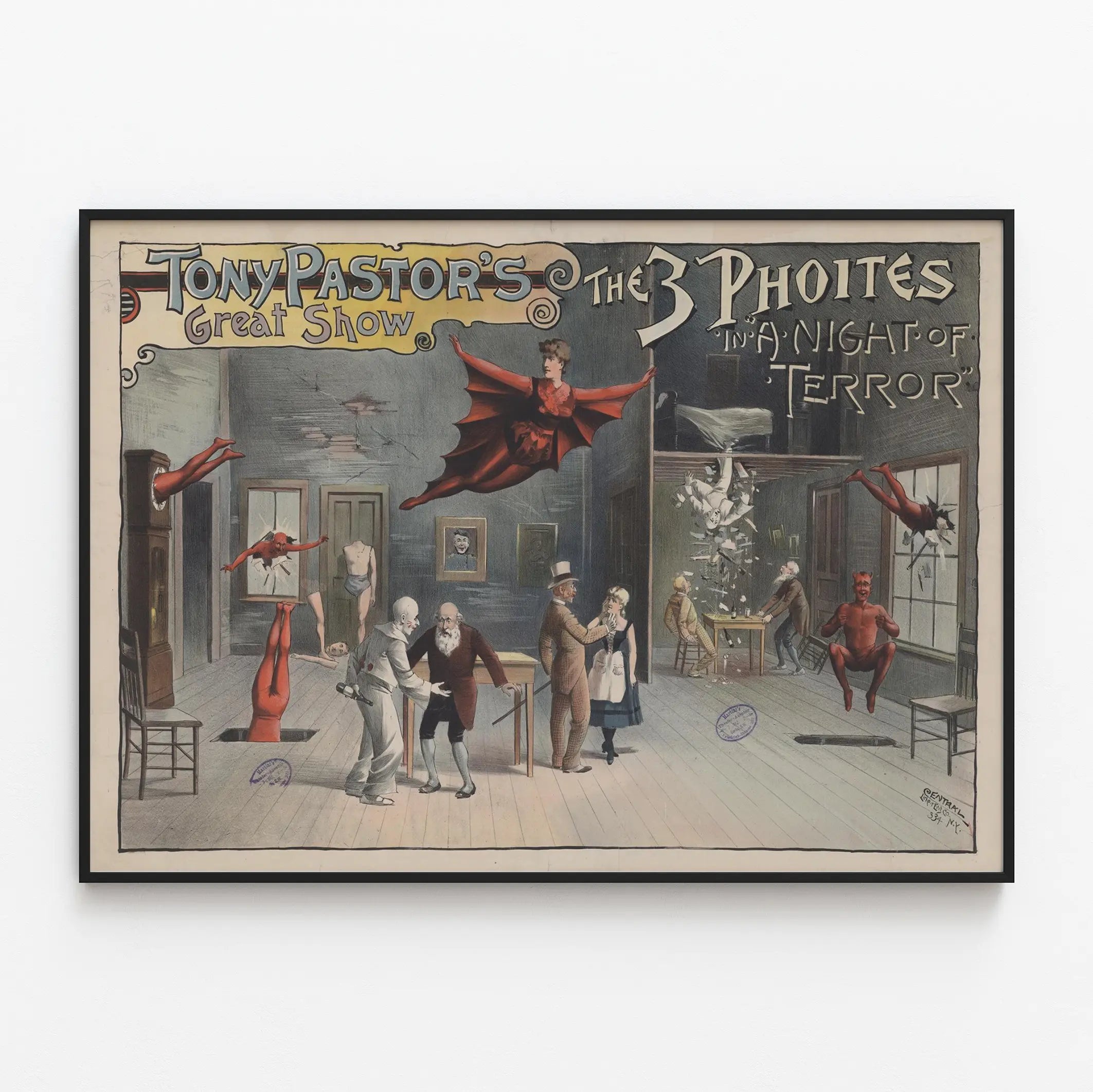 Dieses Vintage-Poster zeigt "Tony Pastor's Great Show" und seine Show mit dem Titel "The 3 Phoites in a Night of Terror", eine überraschende Bühneninszenierung. Dieses Plakat stellt eine Szene voller optischer Täuschungen und erstaunlicher visueller Effekte dar, in der Figuren zu schweben scheinen, durch Wände gehen oder in verschiedenen unmöglichen Positionen projiziert werden. Man sieht rote Figuren, die Dämonen ähneln, menschliche Silhouetten in verschiedenen faszinierenden Posen sowie eine Inneneinrichtung mit alten Möbeln und einem Rahmen, der an einen alten Theaterraum erinnert. Der grafische Stil und die Komposition regen die Fantasie an und schaffen eine Atmosphäre von Geheimnis und Spannung, perfekt für jeden Liebhaber von Retro-Postern oder origineller Wanddekoration mit theater- und fantastischem Thema. Dieses dekorative Plakat passt perfekt in eine Vintage-Wanddekoration und verleiht einem Wohnzimmer, einem Spielraum oder einem kreativen Bereich einen Hauch von Mystik und Geschichte. Die illustrative und farbenfrohe Gestaltung dieses Posters macht es zu einem einzigartigen Dekorationsstück, ideal, um eine Wand mit einem Gemälde oder Poster im alten Charme und illusionistischem Geist zu bereichern. Wählen Sie diese Wanddekoration, um eine fesselnde und überraschungsreiche Atmosphäre in Ihrem Zuhause zu schaffen.