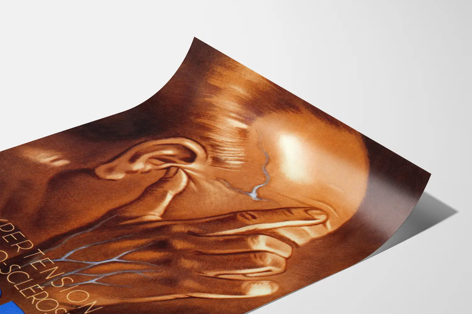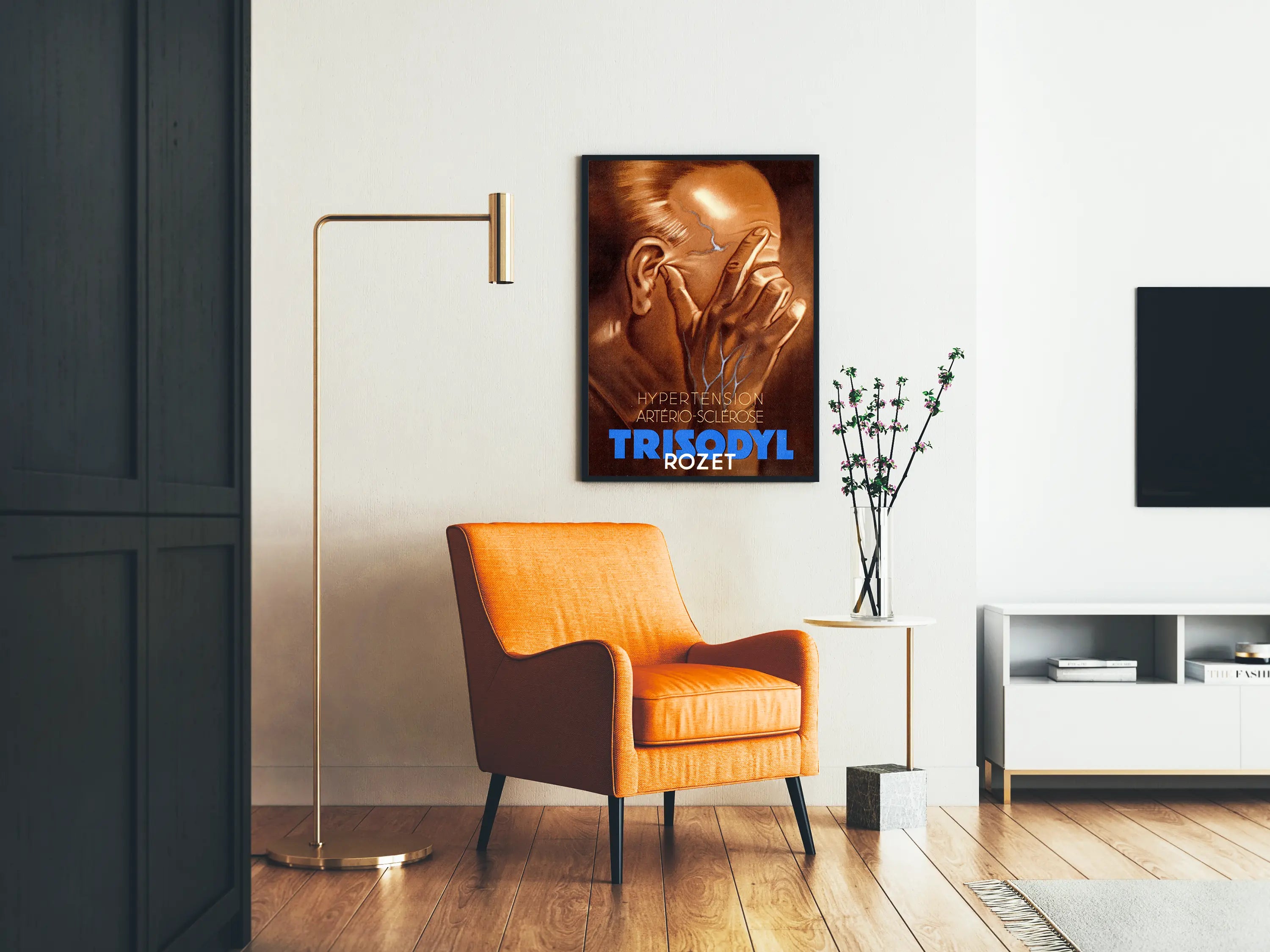 Dieses Vintage-Poster Trisodyl zeigt ein stilisiertes Porträt eines Mannes, der seinen Kopf hält, was die Schmerzen oder Spannungen im Zusammenhang mit arterieller Sklerose-Hypertonie symbolisiert. Die warme, erdige Farbpalette, dominiert von Brauntönen und Ockern, verstärkt die emotionale Intensität und die Ernsthaftigkeit des behandelten medizinischen Themas. Der auf dem Poster vorhandene Text „HYPERTENSION ARTERIOSKLEROSE TRISODYL ROZET“ unterstreicht die Produktidentität und hebt seine therapeutische Verwendung im Kampf gegen Kreislaufstörungen hervor. Diese Retro-Wanddekoration ist ideal für eine medizinische Einrichtung, einen Behandlungsraum oder einen Gesundheitsbereich und verleiht dem Raum eine künstlerische Note, während sie eine klare und informative Botschaft über Bluthochdruck vermittelt. Das sorgfältige Design und die typografische Wahl verleihen diesem Poster einen authentischen Charme, perfekt für Liebhaber vintage-inspirierter Dekorationen und Fachleute, die eine ästhetische und thematische Atmosphäre schaffen möchten. Dieses Poster ist ein ausgesuchtes Stück, um eine Sammlung medizinischer Plakate zu bereichern oder als einzigartiges Dekorationselement für eine Wand. Seine visuelle Wirkung und die präzise Botschaft machen es zu einem sowohl fesselnden als auch lehrreichen Wandbild.