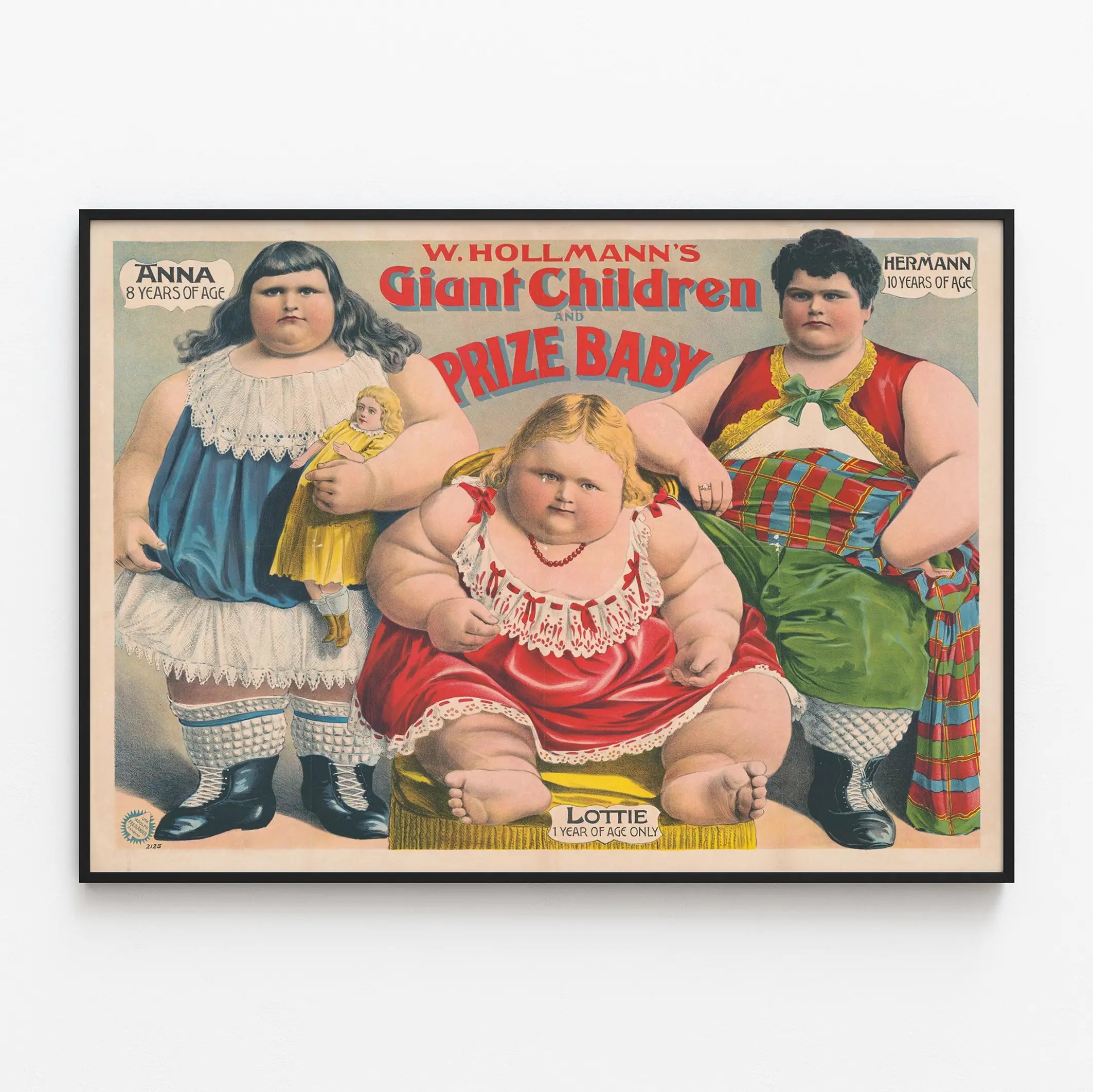 Dieses Vintage-Poster mit dem Titel „W. Hollmanns Riesenkinder und Preisbaby“ ist ein einzigartiges Wanddekorationselement, das sofort ins Auge fällt durch die eindrucksvolle Darstellung von drei außergewöhnlich aussehenden Kindern. Jedes Kind wird mit liebevoll gestalteten Details hervorgehoben: Anna, 8 Jahre alt, hält eine blonde Puppe in gelbem Kleid, während Hermann, 10 Jahre alt, ein rotes und grünes Kleid mit grünem Fliege trägt. In der Mitte sitzt Lottie, ein einjähriges Baby, in einem Sessel mit rotem Kleid und weißer Spitze, und nimmt einen imposanten Platz im Zentrum dieses Posters ein.
