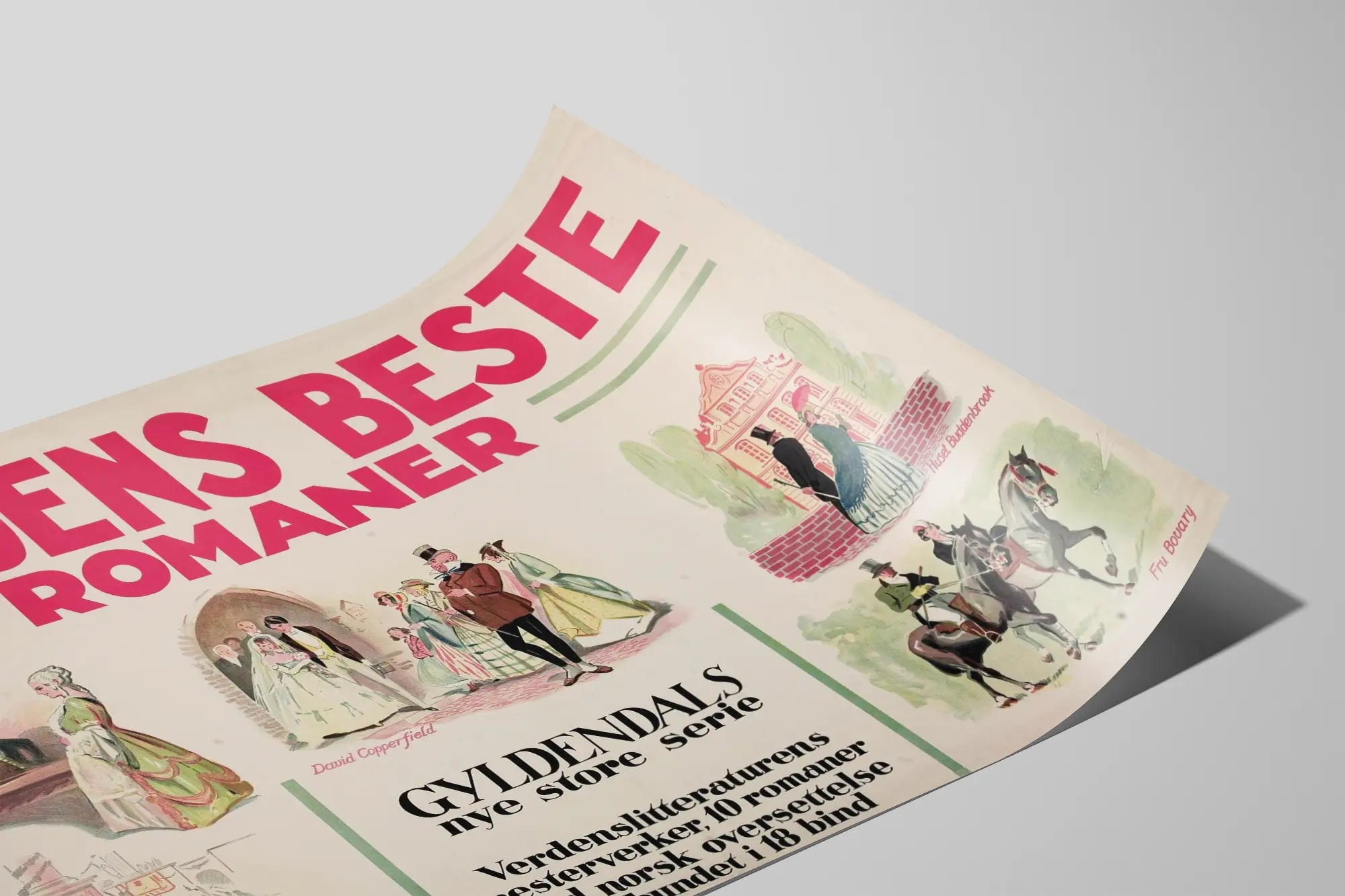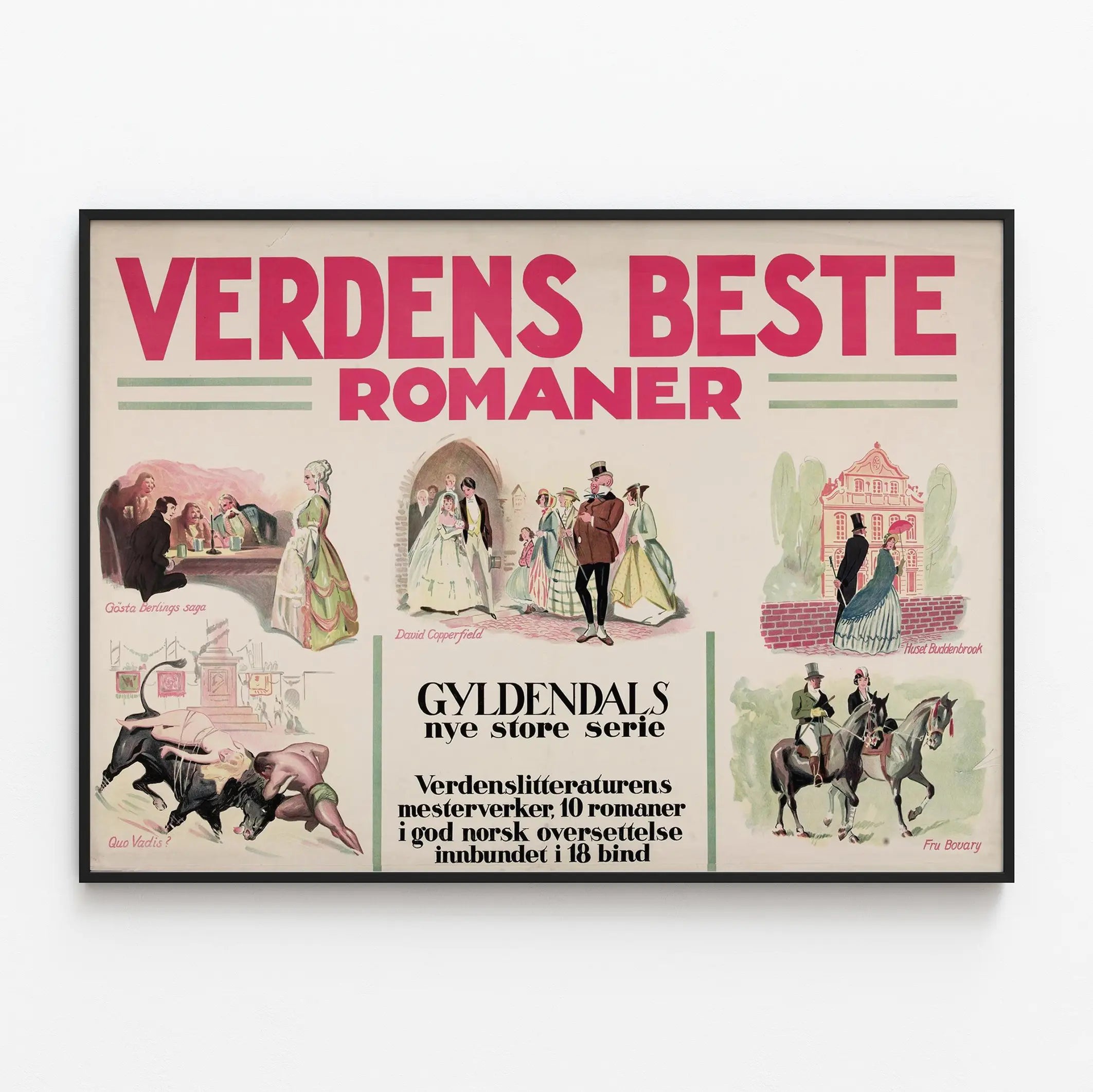 Dieses Vintage-Poster mit dem Titel „Verdens Beste Romaner“ ist ein Wanddekorationselement, das Literatur- und Retro-Design-Liebhaber begeistern wird. Das Plakat zeigt eine Reihe klassischer Romane, die ins Norwegische übersetzt wurden, illustriert mit fein gemalten, ikonischen Szenen. Das Bild zeigt oben einen roten Großbuchstaben-Titel „VERDENS BESTE ROMANER“, eingerahmt von dezenten grünen grafischen Mustern, die eine harmonische Balance und Eleganz verleihen.
