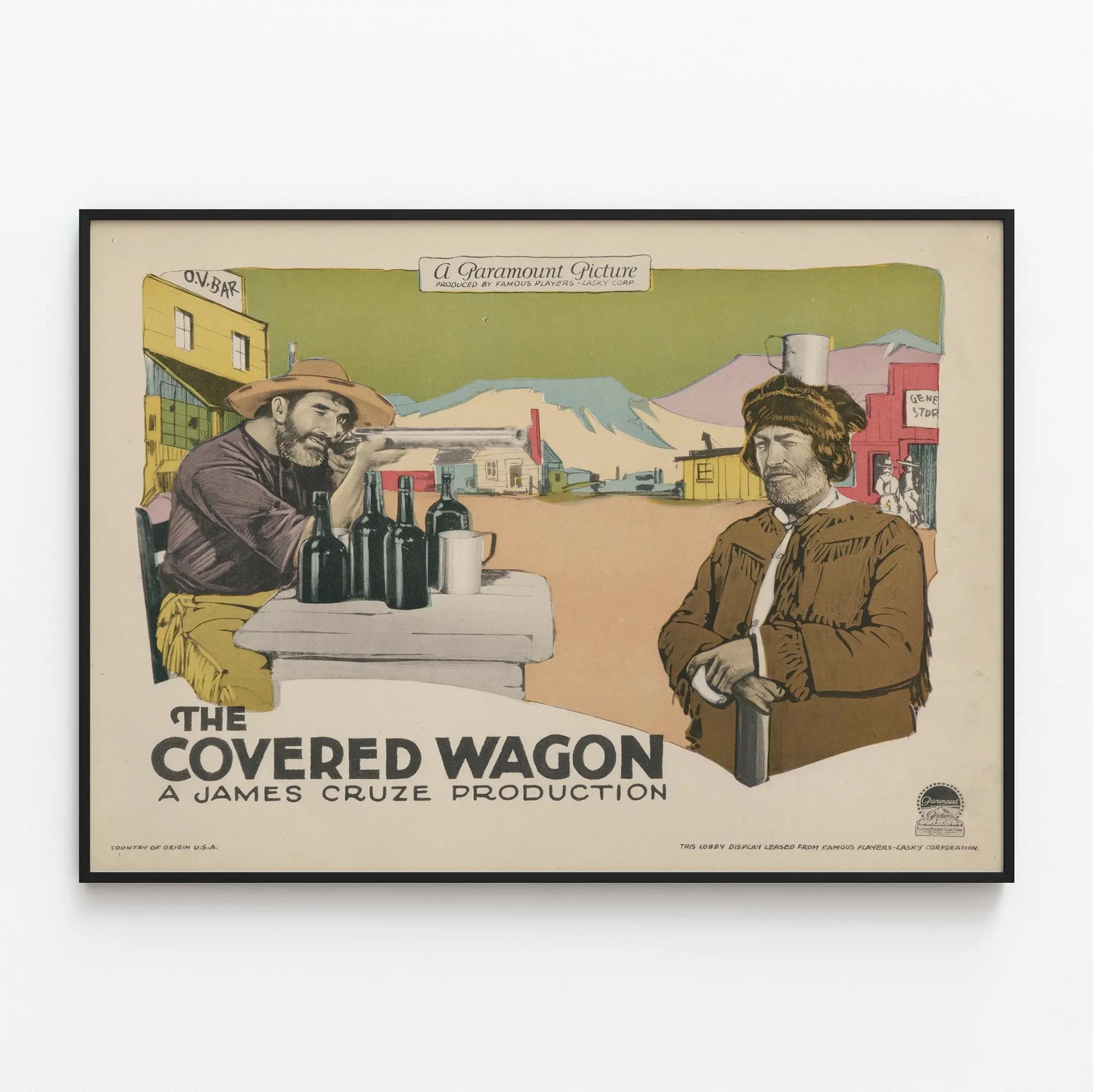 Dieses Vintage-Poster mit dem Titel „The Covered Wagon“ ist ein ideales Wanddekorationselement für Liebhaber klassischer Filme und Western. Dieses Poster, produziert von Paramount Pictures, zeigt eine typische Szene aus dem Wilden Westen, mit zwei Männern in historischer Kleidung: Einer sitzt an einem Tisch und zielt mit einem Gewehr, während der andere, ruhiger, eine Fellmütze und eine Fransenweste trägt. Der farbige Hintergrund zeigt typische Gebäude aus Westernstädten, mit einer Farbpalette, die sowohl sanft als auch kontrastreich ist und eine authentische, zeitlose Atmosphäre schafft. Dieses illustrierte Plakat fängt die Essenz eines alten Dramenfilms ein und erinnert an die Ära des Stummfilms und der ersten Western. Es passt perfekt in eine Wanddekoration im Vintage-Stil mit nostalgischem Charme und verleiht jedem Raum eine reiche Atmosphäre voller Geschichte und amerikanischer Kultur. Als Posterformat eignet es sich besonders gut zur Hervorhebung in einem Wohnzimmer, Büro oder einem Raum, der dem Kino oder Lesen gewidmet ist. Dieses dekorative Bild ist eine Einladung zum Abenteuer und zur Flucht, für alle, die die goldene Ära des Hollywoodkinos mit einer originellen und charaktervollen Wanddekoration wieder erleben möchten. Dank seiner grafischen Gestaltung und seines einzigartigen Stils hebt sich dieses Wandposter als ein zentrales Element für ein authentisches und leidenschaftliches Innendesign hervor.