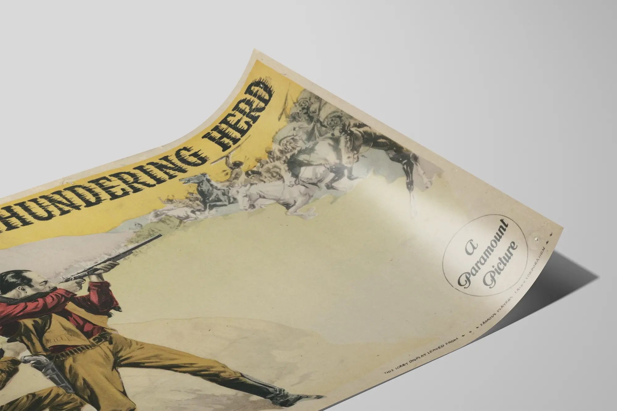 Die Typografie des Titels „The Thundering Herd“ in schwarzen, leicht abgenutzten Großbuchstaben sowie der Name „Zane Grey“, berühmter Autor von Western-Romanen, verstärken den Vintage- und Thematikeffekt des Posters und unterstreichen seine Authentizität und seinen Charme.
