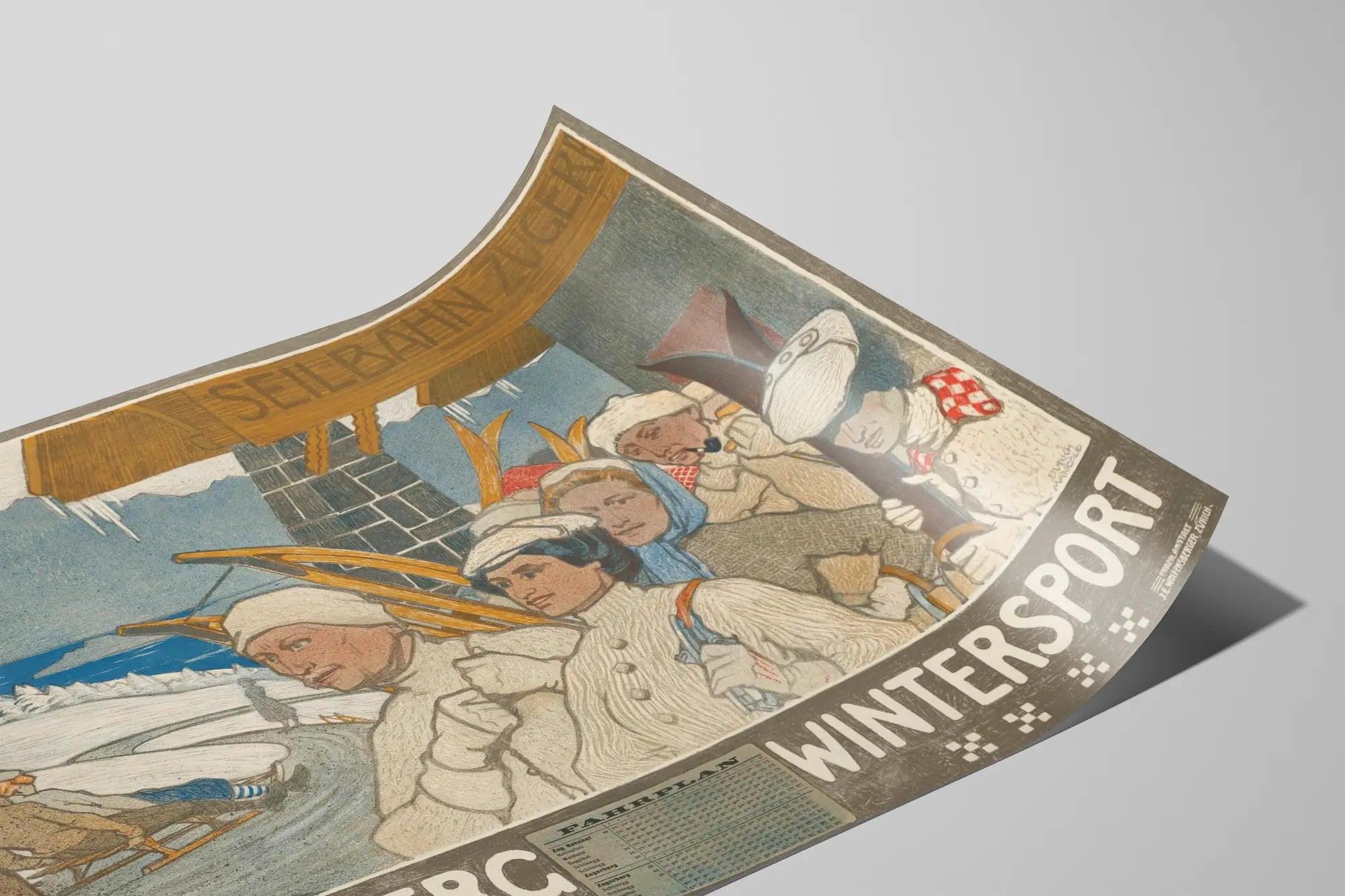 Entdecken Sie dieses außergewöhnliche Vintage-Poster, das dem Zugerberg gewidmet ist – einem ikonischen Ziel des Wintersports in der Schweiz. Dieses Plakat zeigt eine Gruppe von Skifahrern und Wintersportliebhabern in traditionellen Kleidern, bereit, die verschneiten Pisten unter einem klaren Himmel zu genießen. Man sieht auch eine Rodel auf einem gewundenen Weg, der zwischen schneebedeckten Tannen hinabführt, im Hintergrund eine Wasserfläche und eine imposante Gebirgskette, die eine typische Schweizer Alpenlandschaft bieten. Diese Wanddekoration verbindet nostalgischen Charme mit winterlicher Atmosphäre – perfekt für Skifans und Naturliebhaber in den Alpen. Die Illustration hebt die Ausrüstung vergangener Zeiten hervor, wie die Holzskier, die auf der Schulter getragen werden, und Wollmützen, was den authentischen und warmen Charakter dieses Wandbildes unterstreicht. Auch eine Fahrplananzeige ist sichtbar, die die historische Bedeutung des Zugerbergs als mit der Seilbahn erreichbarer Ort betont, um die Fortbewegung in den Bergen zu erleichtern. Dank seiner sanften, natürlichen Farben fügt sich dieses Vintage-Poster harmonisch in jeden Raum ein, der die Welt des Wintersports und die Schönheit der Schweizer Landschaften widerspiegeln möchte. Ob im Wohnzimmer, Schlafzimmer oder in einem Bereich für alpine Dekoration – dieses Wandbild verleiht eine nostalgische und elegante Note. Als dekoratives Plakat ist diese Darstellung des Zugerbergs ideal, um ein Thema Berg, Skifahren oder Natur zu bereichern. Sein zeitloser künstlerischer Stil und seine ausgewogene Komposition ziehen den Blick auf sich und schaffen gleichzeitig eine freundliche und inspirierende Atmosphäre. Dieses Wandkunstwerk verkörpert die Magie des Winters und die einfachen Freuden der Höhenluft im Freien. Für Liebhaber origineller Wanddekorationen, die Geschichte und Leidenschaft für den Wintersport verbinden, ist dieses Zugerberg-Wintersport-Poster die perfekte Wahl. Es ermöglicht, die alpine Tradition durch ein Bild neu zu entdecken, das ebenso an Reisen, Entspannung wie an das Abenteuer auf verschneiten Pisten erinnert. Bringen Sie eine klassische Schweizer Atmosphäre in Ihr Zuhause mit diesem einzigartigen Bild, das die Kunst des Vintage und die natürliche Schönheit des Zugerbergs feiert.