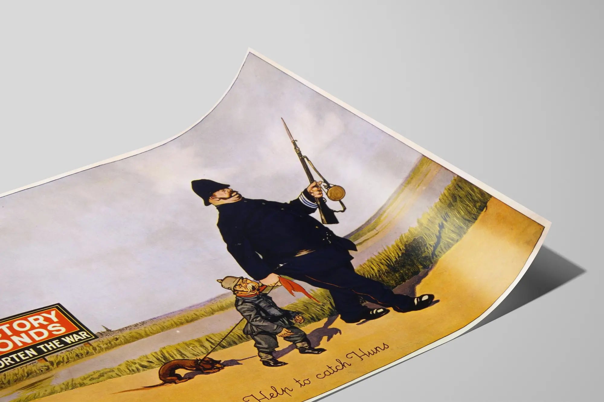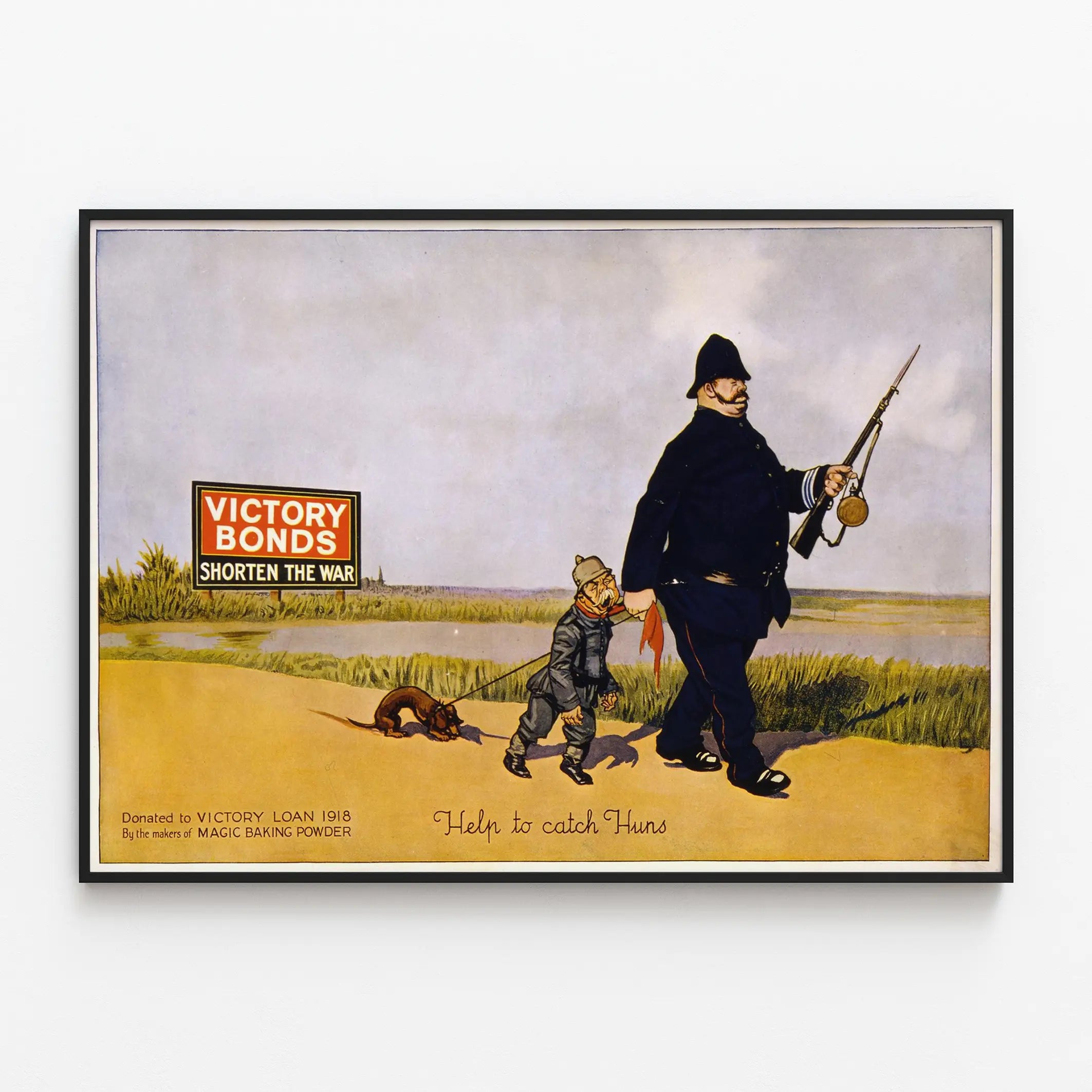 Dieses vintage Propagandaplakat aus dem Jahr 1918 bewirbt die „Victory Bonds“, Kriegsanleihen zur Finanzierung des Kriegseinsatzes. Das Bild zeigt einen britischen Polizisten, der eine Karikatur eines deutschen Soldaten an der Leine führt, was die Gefangennahme der sogenannten „Hunnen“ symbolisiert. Auf der linken Seite des Bildes befindet sich ein klarer und eindrucksvoller Hinweis mit der Botschaft „Victory Bonds verkürzen den Krieg“, der das Ziel unterstreicht, das Ende des Konflikts durch die finanzielle Unterstützung der Bürger zu beschleunigen. Dieses Plakat ist ein ikonisches Beispiel für Wanddekoration mit historischem und militärischem Thema, das die Verwendung des Plakats als Kommunikations- und Mobilisierungsinstrument durch starke Bildsprache illustriert. Sein grafischer Stil und seine klassische Farbpalette verleihen ihm einen einzigartigen Retro-Charme, der sich perfekt in ein Vintage-Interieur oder als thematisches Wanddekorationselement integrieren lässt und Ihrem Raum eine Note von Authentizität und Geschichte verleiht. Ob im Büro, im Lesesaal oder in einem Raum für Sammler, dieses Poster bereichert jede Wanddekoration mit Erinnerungen an das vergangene Jahrhundert. Es handelt sich um eine originelle Illustration, die als Gemälde oder Poster aufgehängt werden kann und sich an Geschichts- und Retro-Design-Enthusiasten richtet. Diese vintage Wanddekoration ist somit eine schöne visuelle Hommage an den Ersten Weltkrieg und die damaligen Spendenkampagnen, ideal, um eine Sammlung historischer Plakate zu vervollständigen oder einen dekorativen Effekt mit Bedeutung und Erbe zu schaffen.