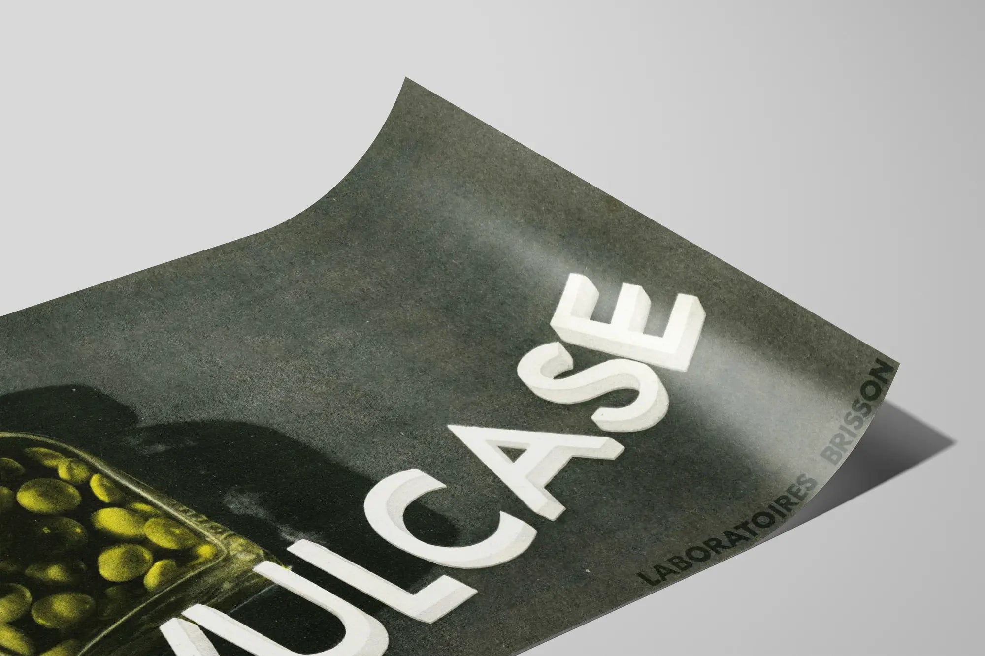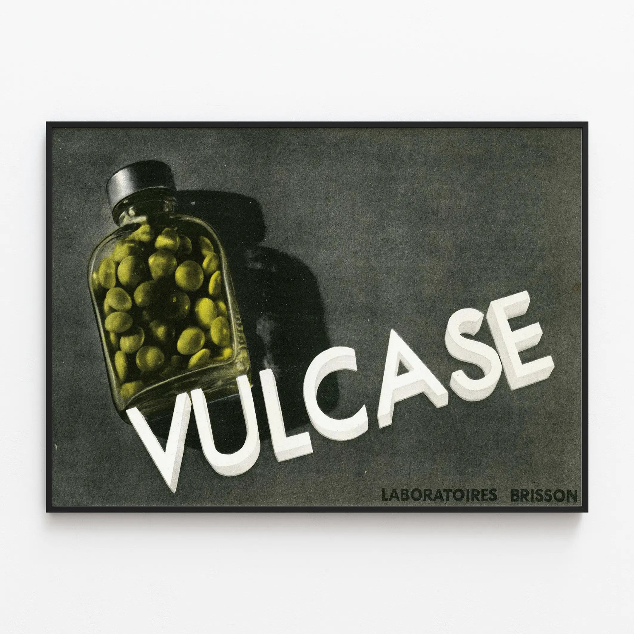 Tauchen Sie ein in die einzigartige Welt der Wanddekoration mit diesem Vintage-Werbeplakat Vulcase, signiert von Laboratoires Brisson. Dieses historische Poster zeigt eine transparente Flasche, gefüllt mit gelben Kapseln oder Kugeln, die einen auffälligen Kontrast zum dunklen Hintergrund bildet. Der Name „VULCASE“ ist in erhabenen weißen Buchstaben geschrieben, was einen Eindruck von Tiefe und Dynamik vermittelt und es zu einem Blickfang in jedem Raum macht. Dieses Plakat spielt meisterhaft mit Schatten und Licht, wodurch der Vintage- und Retro-Charme der Komposition betont wird.