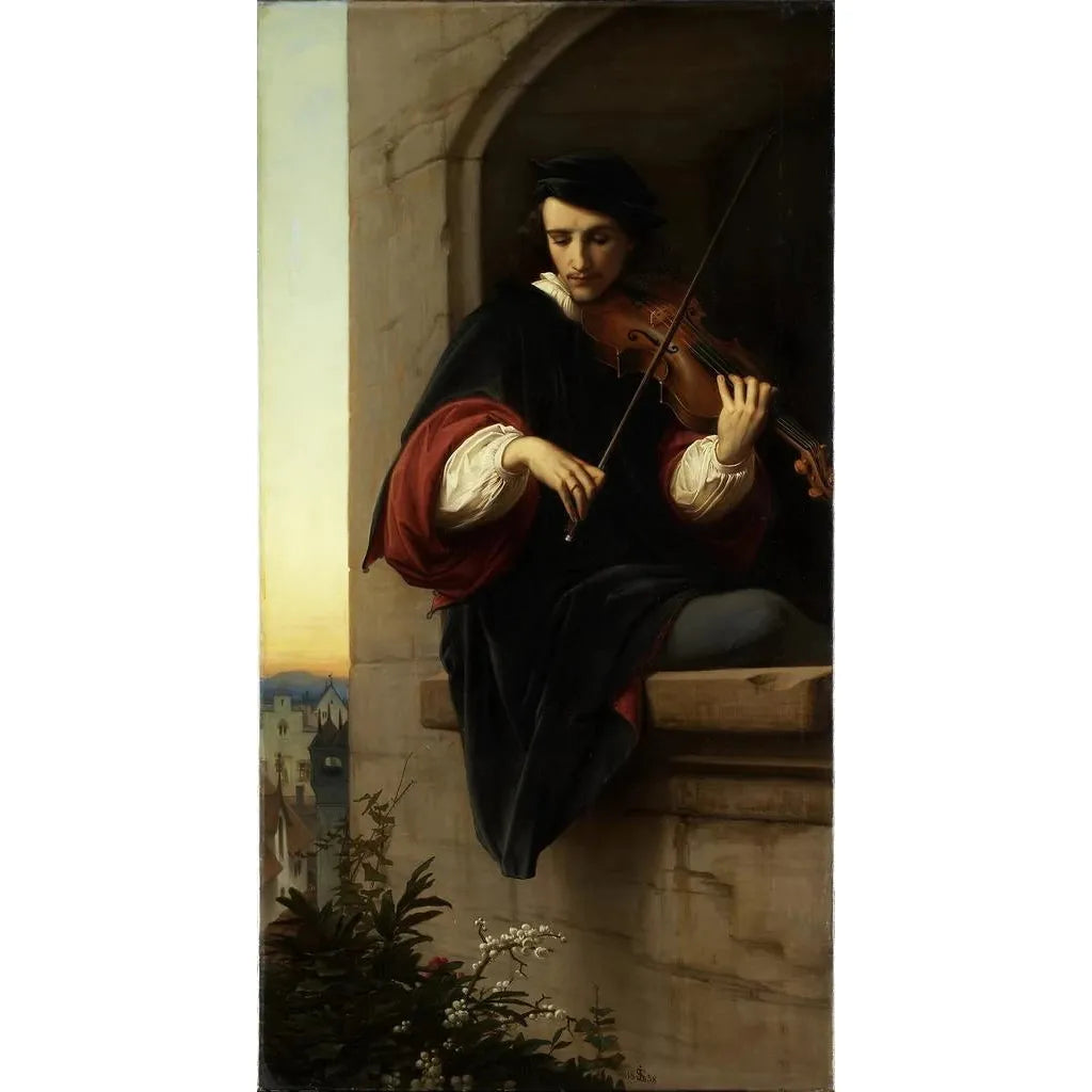 In "Violinist am Kirchturmfester" entführt uns Eduard von Steinle in einen Moment der Gelassenheit und Kontemplation. Das Gemälde zeigt einen Musiker, der in seiner Musik versunken ist und leidenschaftlich am Fenster eines Kirchturms spielt. Die sanften Farben und das Spiel mit Licht schaffen eine intime, fast magische Atmosphäre, in der der Klang über die Leinwand hinaus zu hallen scheint. Die Komposition, mit ihrem harmonischen Gleichgewicht zwischen Innen- und Außenraum, lädt den Betrachter ein, sich in diesem schwebenden Moment vorzustellen, in dem Musik und Kunst aufeinandertreffen.