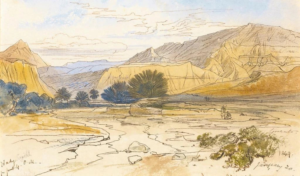 Edward Lear gilt oft als einer der Vorreiter der romantischen Landschaft, der durch Europa und den Nahen Osten reiste, um die Schönheit der Orte, die er besuchte, festzuhalten. Seine Aquarelltechnik, kombiniert mit einem ausgeprägten Beobachtungssinn, ermöglichte es ihm, Werke zu schaffen, die sowohl realistisch als auch poetisch sind. Lear wurde von den Landschaften beeinflusst, die er entdeckte, und "Wadi Tayibeh" ist ein perfektes Beispiel dafür, das seine Liebe zur Natur und seinen Wunsch widerspiegelt, seine Weltanschauung zu teilen. Seine Arbeit inspiriert weiterhin Künstler und Kunstliebhaber im Laufe der Zeit.