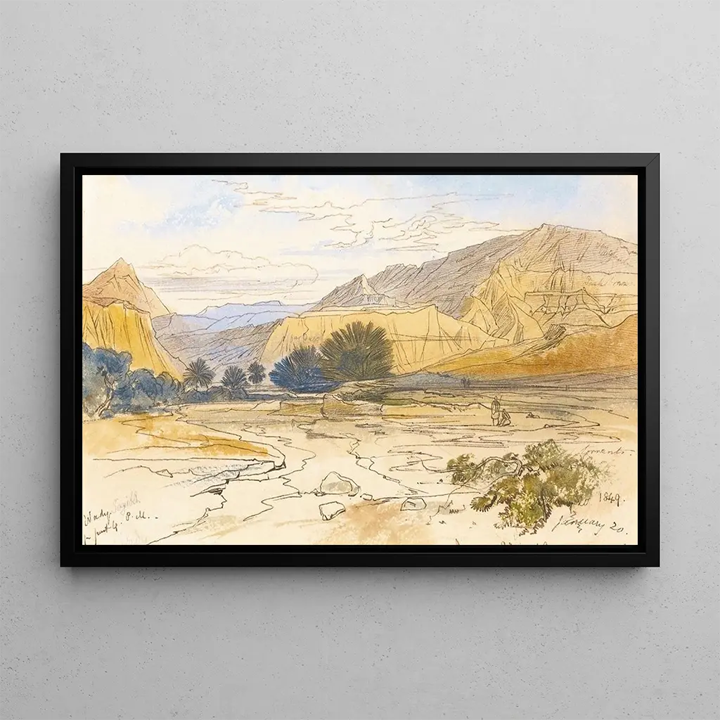 Der kunstdruck von "Wadi Tayibeh, Ägypten" zeigt eine fesselnde Landschaft, in der die warmen Töne der Wüste mit der Frische der grünen Täler verschmelzen. Edward Lear, mit seinem charakteristischen Stil, fängt die wilde Schönheit dieser Region ein und evoziert eine Atmosphäre der Ruhe und Flucht. Die detaillierten Felsen und die Sanftheit der Himmel schaffen eine harmonische Komposition und laden den Betrachter ein, jeden Winkel dieses Gemäldes zu erkunden. Dieses Werk ist eine wahre Ode an die Natur und feiert die Pracht der ägyptischen Landschaften durch zarte Pinselstriche.