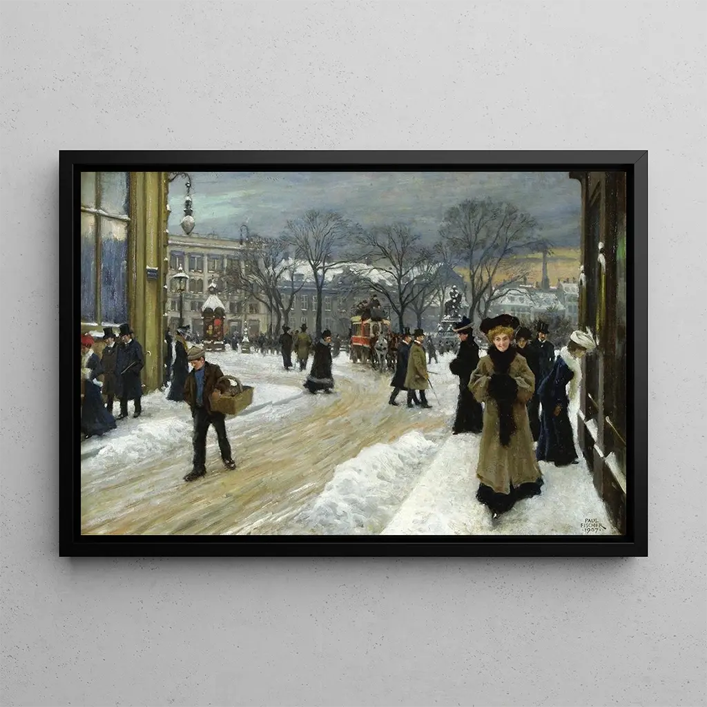 "Jour d'hiver à Kongens Nytorv" von Paul Fischer fängt die Essenz eines kalten Tages in Kopenhagen meisterhaft ein, an dem der Schnee die Pflastersteine und die Silhouetten der Passanten bedeckt. Die weißen und grauen Töne dominieren die Leinwand und schaffen eine winterliche Atmosphäre voller Sanftheit. Fischer verwendet fließende Pinselstriche, um die langsam fallenden Schneeflocken darzustellen, während die architektonischen Details der Gebäude im Hintergrund eine historische Dimension zur Szene hinzufügen. Dieses Werk vermittelt ein Gefühl von Ruhe und Schönheit und lädt den Betrachter ein, in die friedliche Stimmung eines dänischen Winters einzutauchen.