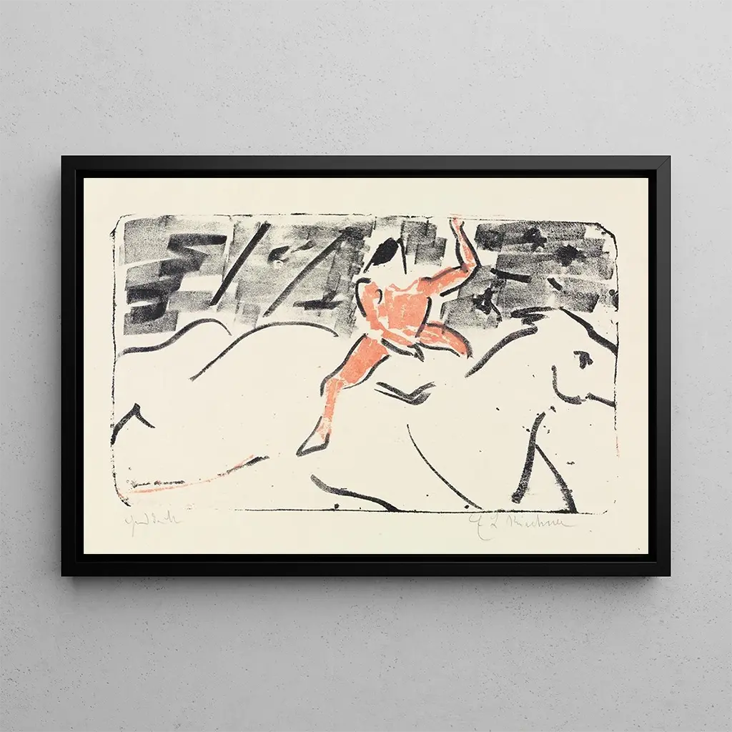 Hauptkünstler des frühen 20. Jahrhunderts, ist Ernst Ludwig Kirchner einer der Gründer der expressionistischen Bewegung. Beeinflusst vom Fauvismus und der primitiven Kunst, entwickelt er einen mutigen Stil, gekennzeichnet durch lebendige Farben und deformierte Formen. Kirchner, der eine turbulente Zeit durchlebte, geprägt von Krieg und Krankheit, nutzt seine Kunst, um seine Emotionen und seine Reflexionen über die Gesellschaft auszudrücken. Sein Werk, oft autobiografisch, spiegelt seine inneren Kämpfe und seinen Wunsch nach Freiheit wider. Der Zirkuskünstler auf einem weißen Pferd ist Teil dieser Flucht- und Lebensfeier-Quest.