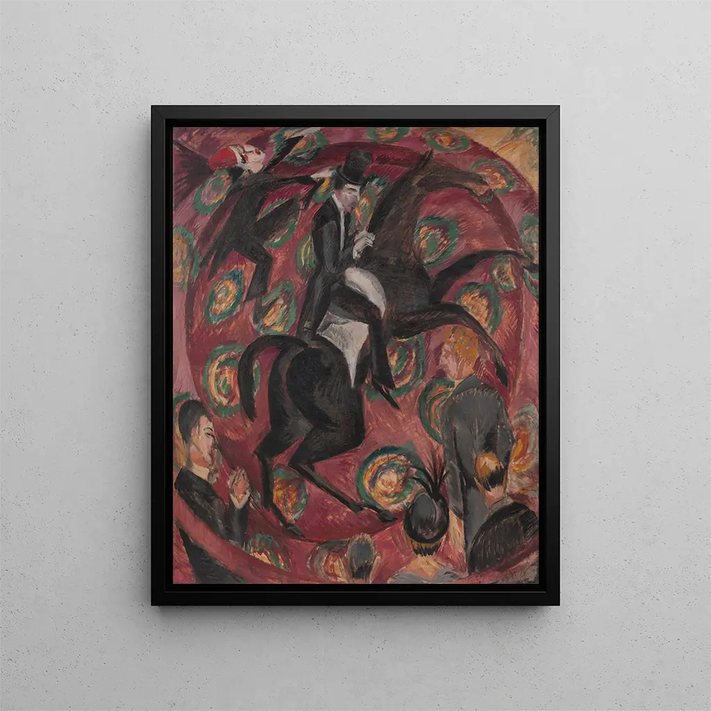 Reproduktion Cavalier de cirque - Ernst Ludwig Kirchner – Einführung fesselnd In der lebendigen Welt des expressionistischen Kunsts hebt sich das Werk "Cavalier de cirque" von Ernst Ludwig Kirchner durch seine Energie und emotionale Tiefe hervor. Dieses Stück, das die Raserei und Magie des Zirkus evoziert, entführt den Betrachter in eine Welt, in der Bewegung und Farbe verschmelzen, um eine Atmosphäre zu schaffen, die sowohl jubelnd als auch verstörend ist. Kirchner, unbestrittener Meister des deutschen Expressionismus, gelingt es, nicht nur das Wesen der Show einzufangen, sondern auch die komplexen Gefühle, die sie umgeben. Der Kunstdruck dieses Werks ermöglicht es, die Dynamik und die visuelle Sprache des Künstlers voll zu schätzen, während er gleichzeitig ein Fenster zu einem ikonischen kulturellen Moment des frühen 20. Jahrhunderts öffnet. Stil und Einzigartigkeit des Werks Der Stil von Kirchner in "Cavalier de cirque" ist geprägt von leuchtenden Farben und mutigen Formen, die auf der Leinwand zu tanzen scheinen. Der Künstler verwendet expressive Pinselstriche, um Bewegung zu suggerieren, wodurch die Figuren unter den Augen des Betrachters lebendig werden. Die Figuren, obwohl stilisiert, besitzen eine spürbare, fast greifbare Präsenz, die die einfache Darstellung übertrifft. Die leuchtenden Töne und die auffälligen Kontraste verstärken den Eindruck einer Szene in voller Aufregung, in der die Energie des Zirkus in all ihrer Pracht entfaltet wird. Kirchner schafft es, eine immersive Atmosphäre zu kreieren, die jeden einlädt, die Aufregung und Intensität dieses Universums zu spüren. Die sorgfältig orchestrierte Komposition lenkt den Blick durch die Leinwand und offenbart die Feinheiten und Details, die das visuelle Erlebnis bereichern. Der Künstler und sein Einfluss Ernst Ludwig Kirchner, ikonische Figur der expressionistischen Bewegung, prägte seine Zeit durch seine Kühnheit und seine einzigartige künstlerische Vision. Geboren 1880, war er einer der Gründer der Gruppe Die Brücke, die eine entscheidende Rolle bei der Neuerfindung der Kunst zu Beginn des 20. Jahrhunderts spielte. Seine Arbeit ist tief beeinflusst von persönlichen Erfahrungen, psychologischen Störungen und gesellschaftlichen Umbrüchen seiner Zeit. Kirchner schöpfte aus diesen Elementen, um einen Stil zu formen, der mit einer seltenen emotionalen Intensität resoniert. Durch seine