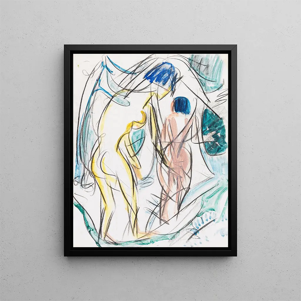 Einführung in den faszinierenden Kunstdruck "Zwei Akte im Wald" von Ernst Ludwig Kirchner In der lebendigen Welt der modernen Kunst hebt sich das Werk "Zwei Akte im Wald" von Ernst Ludwig Kirchner durch seine Kühnheit und psychologische Tiefe hervor. Dieses Gemälde, in dem Natur und menschliche Figur verschmelzen, lädt den Betrachter ein, in eine Welt einzutauchen, in der Sinnlichkeit und Spiritualität koexistieren. Kirchner, eine ikonische Figur des Expressionismus, hat es verstanden, das Wesen der menschlichen Seele durch stilisierte Formen und leuchtende Farben einzufangen. Die dargestellte Szene, sowohl intim als auch universell, vermittelt eine tiefe Verbindung zur Natur und eine Erforschung menschlicher Emotionen, was dieses Werk besonders berührend und zeitlos macht. Stil und Einzigartigkeit des Werks "Zwei Akte im Wald" zeichnet sich durch eine leuchtende Farbpalette und dynamische Linien aus, die eine fast spürbare Bewegung erzeugen. Kirchner verwendet lebendige Töne, um die Gefühle seiner Figuren auszudrücken, ihnen eine Aura zu verleihen, die sowohl sinnlich als auch melancholisch ist. Die weiblichen Figuren, nackt und gelassen, integrieren sich harmonisch in die Waldlandschaft und deuten eine Symbiose zwischen Mensch und Natur an. Die Behandlung der Formen, sowohl vereinfacht als auch expressiv, zeugt vom Einfluss des Fauvismus, während sie gleichzeitig eine persönliche Suche des Künstlers widerspiegelt. Das Werk, obwohl es in einer greifbaren Realität verwurzelt ist, transzendiert den Alltag durch seinen emotionalen und spirituellen Ansatz und spiegelt so die existenziellen Anliegen der Zeit wider. Der Künstler und sein Einfluss Ernst Ludwig Kirchner, geboren 1880, ist einer der Gründer der expressionistischen Gruppe Die Brücke, die eine bedeutende Rolle in der Entwicklung der Kunst zu Beginn des 20. Jahrhunderts spielte. Sein künstlerischer Werdegang ist geprägt von einer unermüdlichen Suche nach Authentizität und persönlichem Ausdruck, oft als Reaktion auf akademische Konventionen. Kirchner wurde tief beeinflusst von seinen Reisen in die Schweiz und nach Italien sowie von der primitiven Kultur, die er in seine Arbeit integrierte, um die Themen Leben, Tod und Schönheit zu erforschen. Sein einzigartiger Stil ebnete den Weg für zahlreiche zeitgenössische Künstler, und sein Einfluss ist noch heute spürbar, sowohl in der