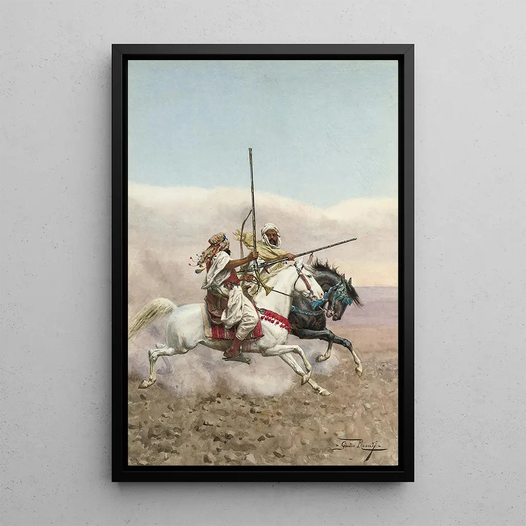 Deux cavaliers arabes : eine Hommage an Mut und Freiheit „Deux cavaliers arabes“ von Giulio Rosati ist ein Kunstdruck, der die Kraft und Majestät der Pferde hervorhebt, Symbole für Freiheit und Mut. In dieser Komposition scheinen die Reiter, gekleidet in traditionelle Kostüme, anmutig durch eine Wüstenlandschaft zu galoppieren, in der sich Sand- und Himmelsschattierungen harmonisch verbinden. Die Technik von Rosati, die Realismus und Dynamik verbindet, fängt die Bewegung der Pferde und die Intensität der Blicke der Reiter ein und schafft eine Atmosphäre, die sowohl episch als auch poetisch ist. Dieses Kunstwerk lädt dazu ein, von fernen Abenteuern und exotischen Landschaften zu träumen. Giulio Rosati: ein Künstler im Herzen des Orientalismus Giulio Rosati, geboren 1858, ist ein italienischer Maler, der die Bewegung des Orientalismus mit seinen lebendigen und ausdrucksstarken kunstwerken prägte. Beeinflusst von seinen Reisen nach Nordafrika und im Nahen Osten, konnte er die Schönheit der Landschaften und die Vielfalt der Kulturen, denen er begegnete, authentisch wiedergeben. Sein Stil, geprägt von einer sorgfältigen Detailarbeit und einer leuchtenden Farbpalette, ermöglichte es ihm, sich unter seinen Zeitgenossen hervorzuheben. „Deux cavaliers arabes“ veranschaulicht perfekt sein Talent und sein Interesse an orientalischen Themen und bietet einen faszinierenden Einblick in eine Epoche, in der der Orient eine Inspirationsquelle für viele Künstler war. Eine dekorative Anschaffung mit vielfältigen Vorzügen Der Kunstdruck von „Deux cavaliers arabes“ ist eine ideale Dekorationswahl für alle, die ihrem Interieur einen Hauch Exotik verleihen möchten. Ob im Wohnzimmer, Büro oder Schlafzimmer, dieses Kunstwerk wird die Blicke auf sich ziehen und Bewunderung hervorrufen. Die Druckqualität garantiert eine außergewöhnliche Treue zu den Details des Originalwerks, sodass man die dynamische und ausdrucksstarke Atmosphäre der Szene voll genießen kann. Durch die Hinzufügung dieses Kunstdrucks zu Ihrer Sammlung bereichern Sie Ihren Wohnraum mit einem Kunstwerk, das Eleganz und Geschichte vereint.