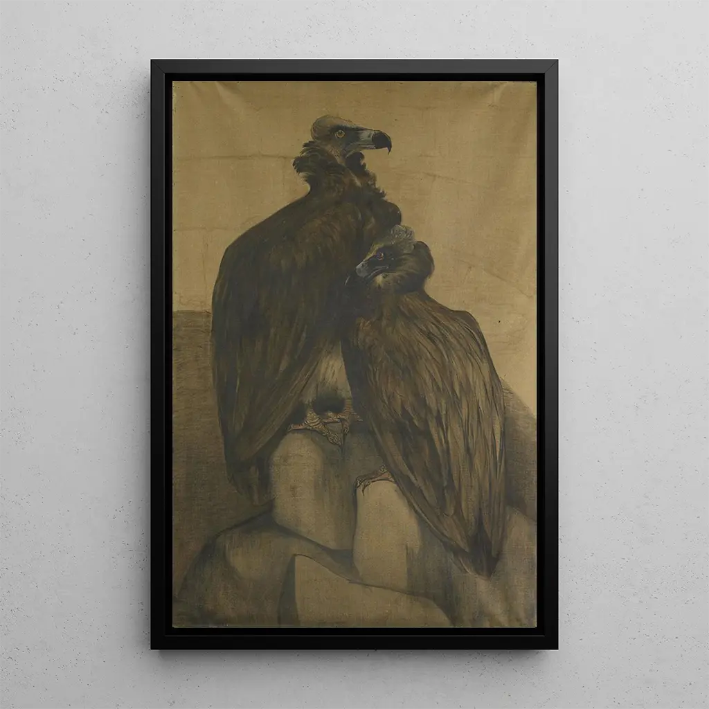 In "Zwei Wüstenadler" fängt Theo van Hoytema die Anmut und Kraft dieser majestätischen Vögel ein. Die Komposition hebt erdige Töne und Blaunuancen hervor, die einen ruhigen Himmel hervorrufen. Die Technik des Künstlers, die Aquarell und Zeichnung kombiniert, schafft eine Atmosphäre, die sowohl realistisch als auch poetisch ist. Die Adler, mit ausgebreiteten Flügeln, scheinen im Raum zu schweben und bieten eine faszinierende Sicht auf die Natur. Jedes Detail, von den Federn bis zu den Schatten, ist sorgfältig ausgearbeitet und lädt den Betrachter ein, die Schönheit dieser oft missverstandenen Kreaturen zu bewundern.