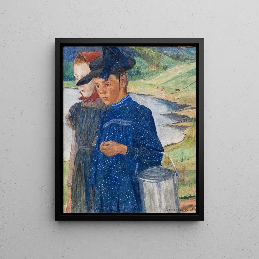 Reproduktion Deux filles sur la route - Carl Wilhelmson – Fesselnde Einführung In der reichen und faszinierenden Welt der Kunst gelingt es einigen Werken, die Essenz der Menschlichkeit durch Szenen des Alltags einzufangen. "Zwei Mädchen auf der Straße", geschaffen von Carl Wilhelmson, ist eines dieser Werke, das eine sanfte Melancholie und zeitlose Schönheit evoziert. Dieses Gemälde, das im Herzen einer lebendigen Natur entfaltet wird, hebt die Verbundenheit und Unbekümmertheit der Kindheit hervor und lädt den Betrachter ein, in eine Welt voller Nostalgie einzutauchen. Der Künstler schafft es, mit einer zarten Farbpalette und subtiler Lichtführung eine Atmosphäre zu kreieren, die sowohl beruhigend als auch evocativ ist, wobei jedes Detail eine Geschichte zu erzählen scheint. Stil und Einzigartigkeit des Werks Der Stil von Carl Wilhelmson zeichnet sich durch seinen impressionistischen Ansatz aus, bei dem Licht und Farbe eine zentrale Rolle spielen. In "Zwei Mädchen auf der Straße" ist die Komposition sorgfältig gestaltet, wobei die beiden Protagonistinnen in einem Raum erscheinen, der sowohl intim als auch offen wirkt. Die Nuancen von Grün und Blau, kombiniert mit goldenen Lichtakzenten, verleihen dem Werk eine fast traumhafte Dimension. Die Gesichter der Mädchen, zart skizziert, drücken eine Bandbreite an Emotionen aus, von Freude bis Kontemplation. Wilhelmson gelingt es, den flüchtigen Moment der Kindheit einzufangen, eine Zeit, in der jeder Augenblick von Magie und Entdeckungen geprägt ist. Die Fließfähigkeit der Linien und die Leichtigkeit der Formen zeugen von einer technischen Meisterschaft, die den reinen Realismus übertrifft und eine poetische Sicht auf das Leben bietet. Der Künstler und sein Einfluss Carl Wilhelmson, eine bedeutende Figur der schwedischen Kunst des frühen 20. Jahrhunderts, konnte sich dank seines Talents und seiner Sensibilität durchsetzen. Ausgebildet an der Königlichen Kunstakademie Stockholm, wurde er von den großen Meistern des Impressionismus beeinflusst, entwickelte jedoch einen eigenen Stil. Sein Werk ist geprägt von einer ständigen Suche nach Licht und Farbe, Elementen, die er als wesentlich erachtet, um menschliche Emotionen zu vermitteln. Wilhelmson war auch ein leidenschaftlicher Verfechter der Natur, die in seinen Gemälden oft als eigenständige Figur dargestellt wird. Sein Einfluss auf seine Zeitgenossen