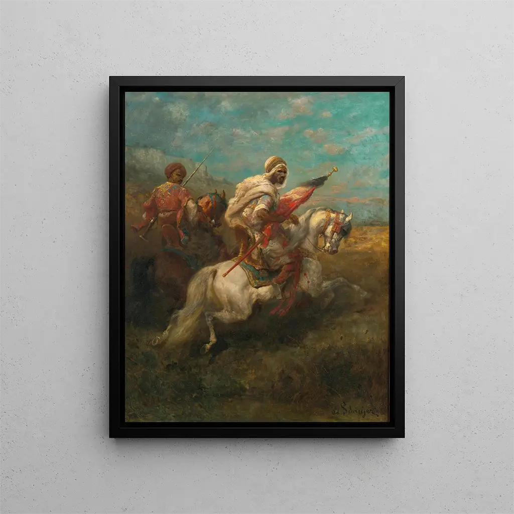Adolf Schreyer, geboren 1828, gilt als einer der Meister der Landschafts- und Pferdeszenenmalerei des 19. Jahrhunderts. Vom romantischen Bewegung beeinflusst, verstand er es, seine Liebe zur Natur mit einer realistischen Darstellung der Figuren zu verbinden. Sein Werk ist geprägt von tiefem Respekt vor dem Sujet, sei es die Majestät der Pferde oder die Größe der Landschaften. Schreyer war auch ein Pionier in der Darstellung alltäglicher Szenen und suchte, Momente von Mut und Heroismus zu verewigen. Sein Einfluss auf die Kunstszene ist unbestreitbar, da er viele zeitgenössische Künstler inspirierte, die Verbindung zwischen Mensch und Natur zu erforschen. Die Reproduktion "Zwei Reiter zu Pferd - Adolf Schreyer" spiegelt diesen nachhaltigen Einfluss wider und zeigt die Fähigkeit der Kunst, zeitlose Momente einzufangen.