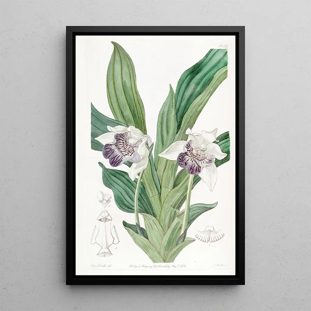 Das Bild Zygopetalum mit L-Lippen, geschaffen von Sydenham Edwards, entführt uns in eine faszinierende botanische Welt. Die lebendigen Farben dieses Werks, die von tiefem Grün bis zu leuchtendem Violett reichen, spiegeln die Fülle der Natur wider. Die Aquarelltechnik, meisterhaft ausgeführt, fängt die Zartheit der Blütenblätter und die Textur der Blätter ein. Die Atmosphäre, die von dieser kunstdruck ausgeht, ist sowohl beruhigend als auch inspirierend und lädt den Betrachter zu einer aufmerksamen Betrachtung der feinen Details dieser seltenen Orchidee ein.